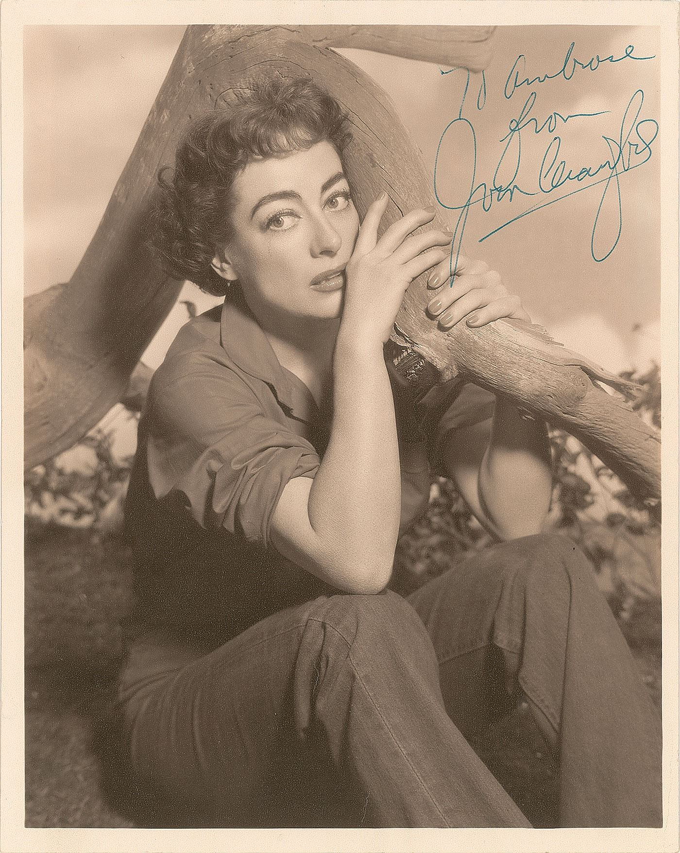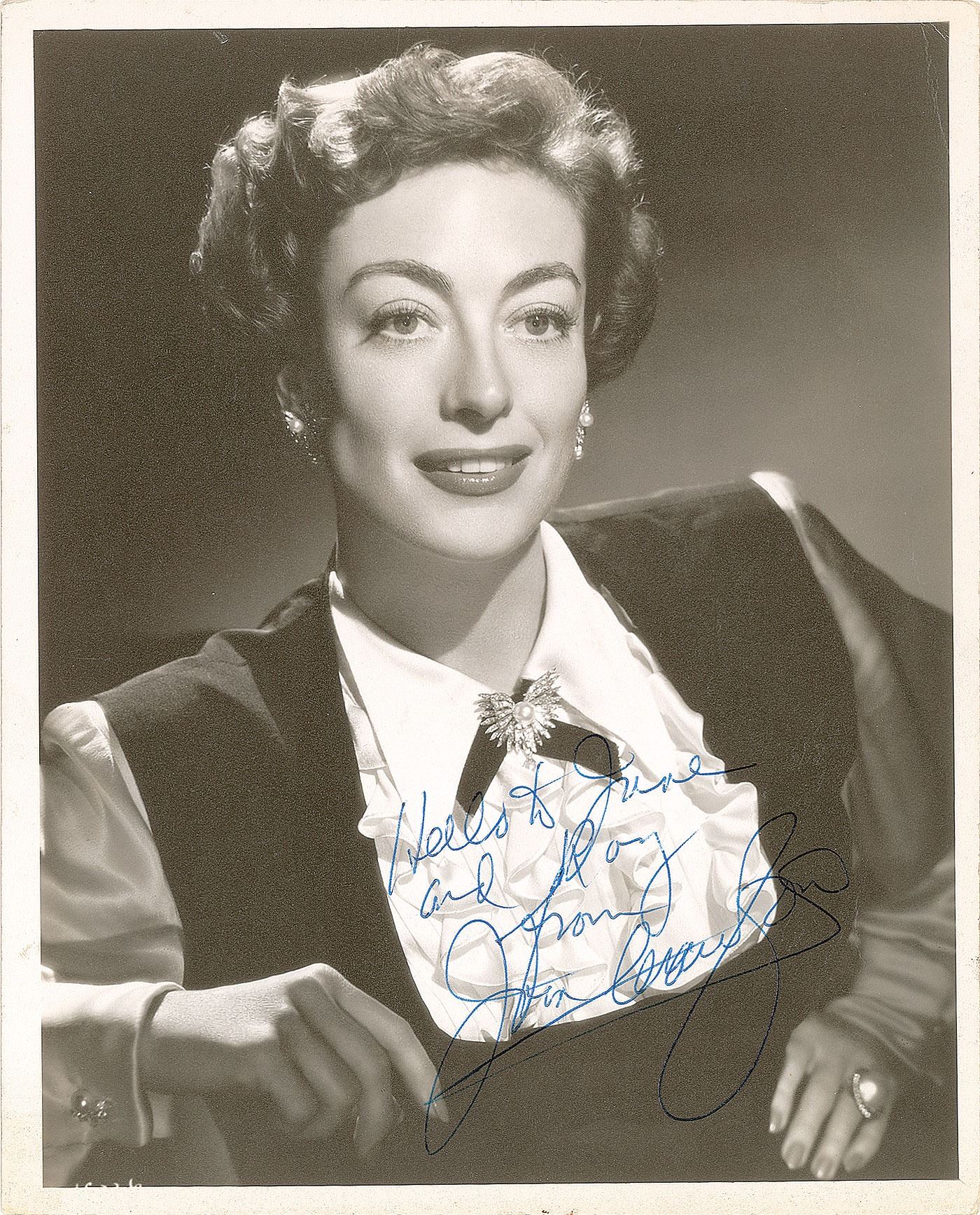Three matte-finish photos signed by Joan Crawford, including: an 8 x 10 studio portrait by Bert Six, signed and inscribed in blue ballpoint, "Hello to June and Roy, from, Joan Crawford,” with the reverse bearing a Warner Bros. photography stamp; and two photos of Crawford as Vienna in the 1954 film Johnny Guitar, both approximately 8 x 10, both signed and inscribed in ballpoint, "Hi to Walter, from, Joan Crawford” and “To Ambrose, from Joan Crawford.” In overall fine condition.