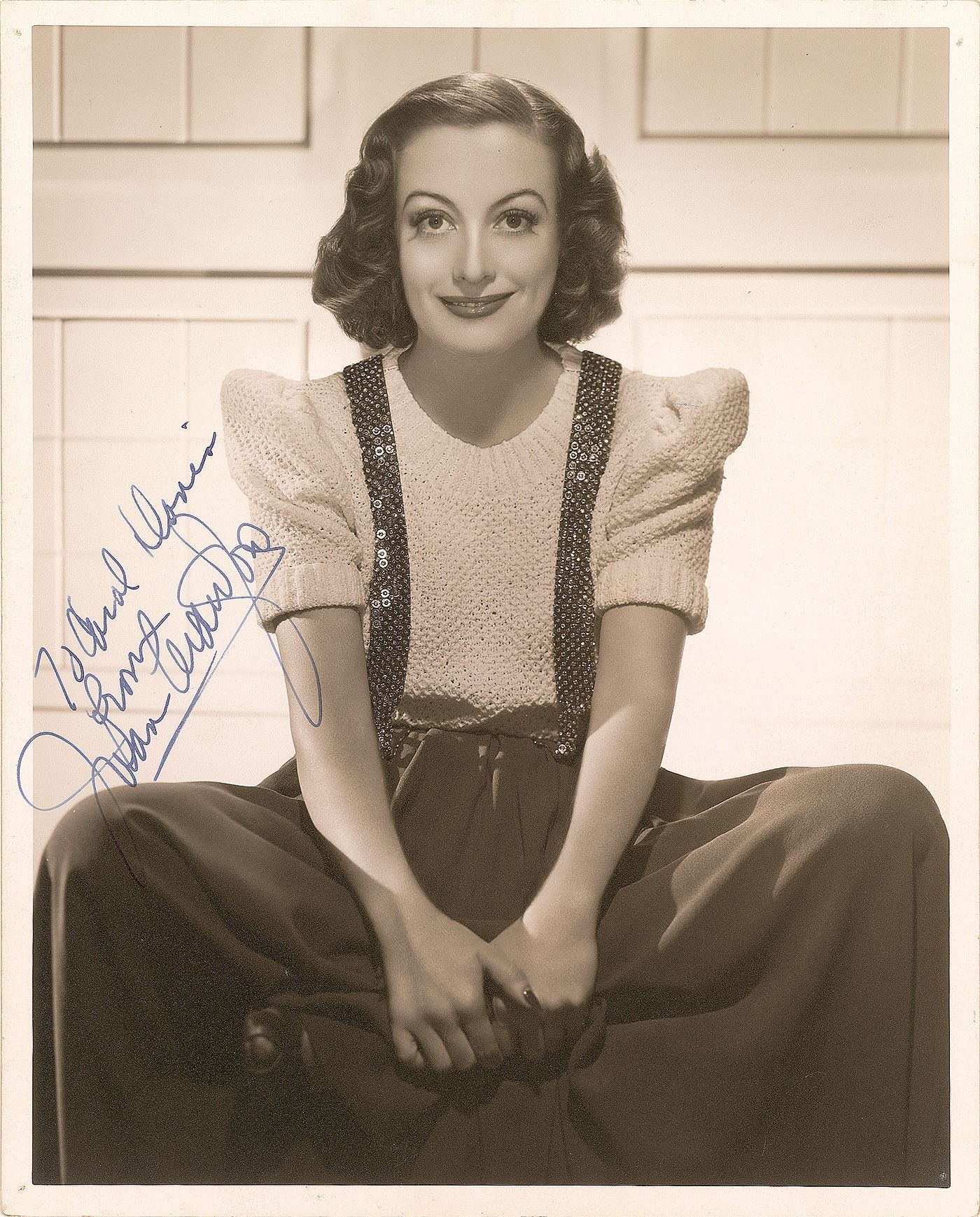 Three photos signed by Joan Crawford, including: a stunning vintage pearl-finish 8 x 10 photo of Crawford by George Hurrell, signed and inscribed in fountain pen, "To Carol, from Joan Crawford," with the reverse bearing a Hurrell/MGM credit stamp; a matte-finish 8 x 10 photo of Crawford staring directly into the camera, signed and inscribed in black ink, "To Carroll Davis, from, Joan Crawford"; and a vintage matte-finish 8 x 10 seated portrait of Crawford by famed MGM photographer Laszlo Willinger, signed and inscribed in fountain pen, "To Carol Davis, from, Joan Crawford," with the reverse bearing an MGM-Willinger credit stamp. In overall fine condition, with pin and tack holes to corners and a few small creases.