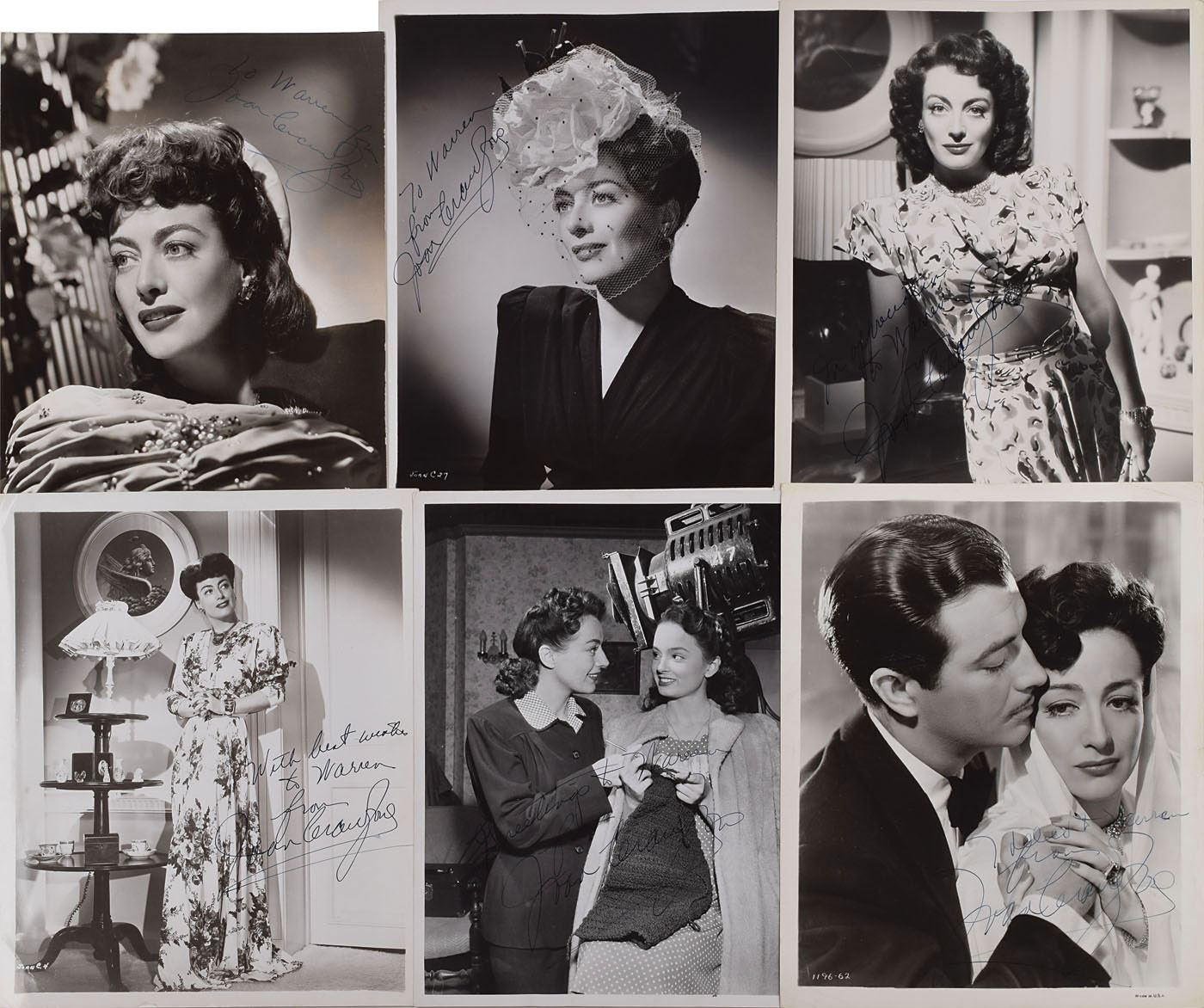 Nice collection of six vintage glossy photos of Joan Crawford, ranging in size from 7.5 x 9.5 to 8 x 10, each signed and inscribed in fountain pen to "Warren." In overall fine condition, with trimmed edges to one photo and some mild scattered creasing.