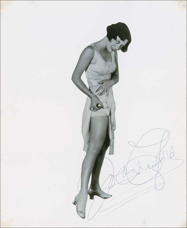Two items: TLS, signed “Joan,” one page, 6 x 7, on her personal letterhead, dated February 13, 1965. Crawford writes to a sick admirer. In part: “I have recently finished ‘I Saw What You Did,’ which I made at Universal Studios with John Ireland. It was a wonderful, suspenseful story, and I hope it will come off well on the screen.;”and a glossy 8 x 10 photo of Crawford showing off her legs, signed in blue ballpoint. In fine condition, with scattered creases and surface marks to photo, as well as some light corner toning. Pre-certified PSA/DNA and RRAuction COA.