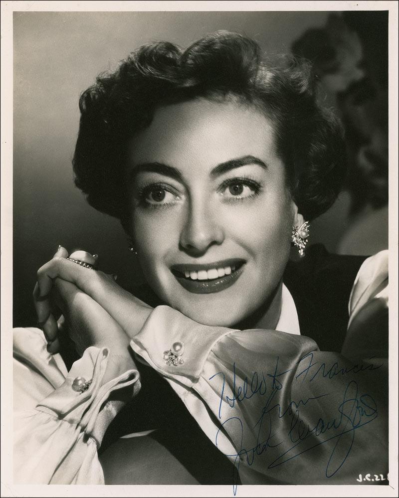 Vintage matte-finish 8 x 10 photo, signed and inscribed in blue ink “Hello to Francis from Joan Crawford.” In fine condition, with a light brush to signature, slight binder dings to left edge, and a few small corner tip creases. Pre-certified PSA/DNA and RRAuction COA.
