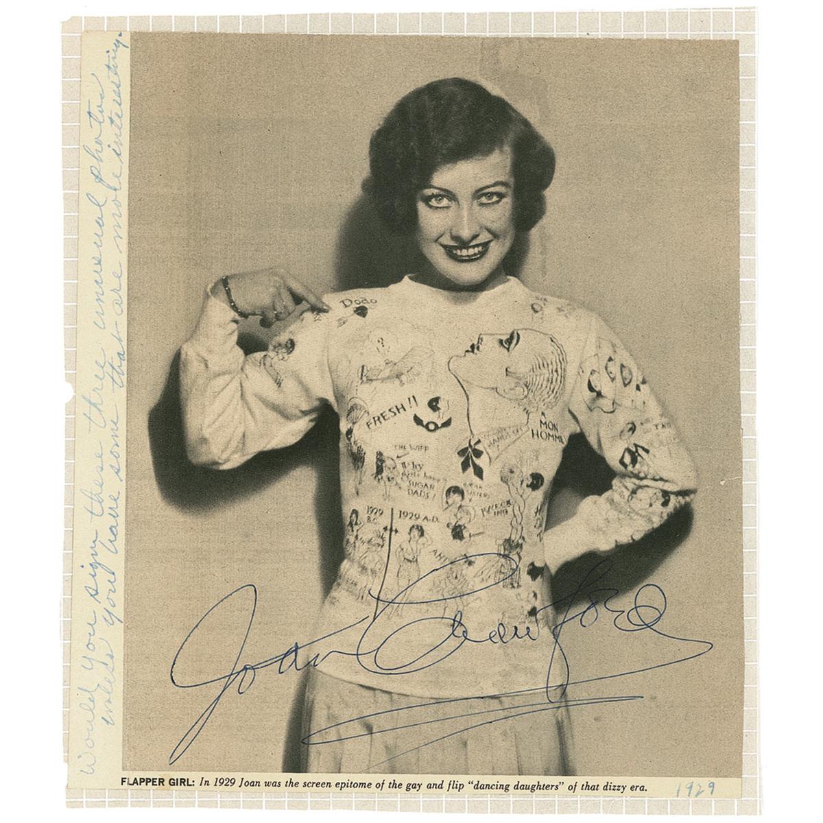 Original 7.5 x 8.5 trimmed magazine photo of a young Crawford pointing to the word ‘Dodo,’ on the shoulder of her comical top, signed in blue ballpoint. Collector’s notation along left margin reads “Would you sign these three unusual photos unless you have some that are more interesting.” Photo is affixed to a slightly larger sheet. In fine condition, with aforementioned trimmed edges, and a small tear to right edge.