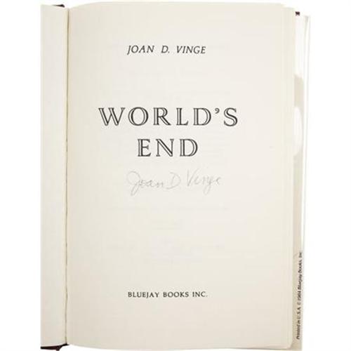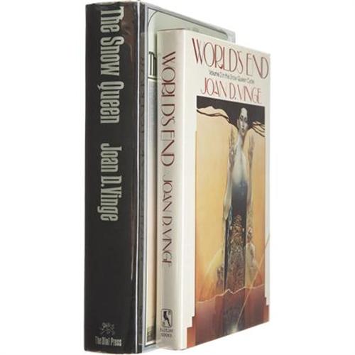 <B>Joan D. Vinge: Two Signed First Editions.</B></I> Includes the following:<BR><B><I>The Snow Queen</B></I></B></I> (New York: Dial Press, 1980), first edition, 536 pages, light blue boards, 8vo, dust jacket. Condition (book/ dj): very fine / very fine<BR><B><I>World's End</B></I></B></I> (New York: Bluejay Books, 1984), first edition, 230 pages, maroon boards, 8vo, dust jacket. Condition (book/ dj): very fine / very fine<BR><BR><b>Shipping:</b> Books & Catalogs (<a target="_blank" href="http://www.heritageauctions.com/common/shipping.php">view shipping information</a>)