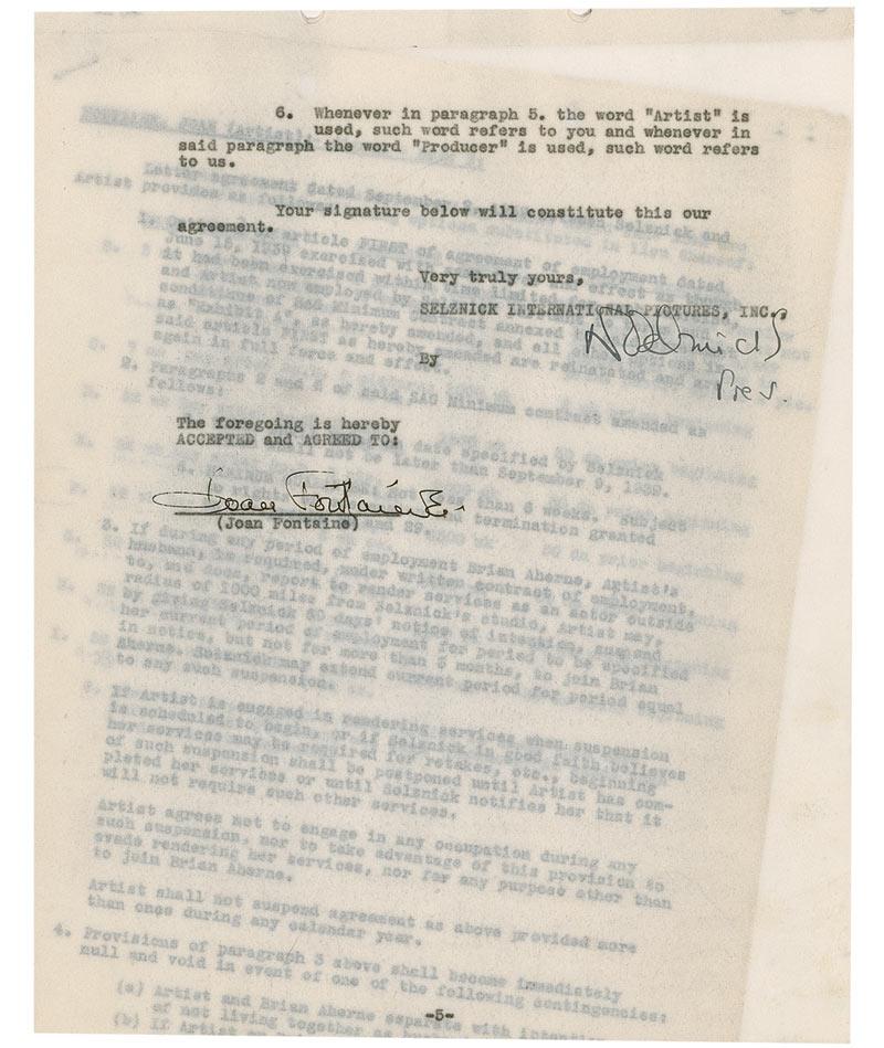DS, signed “Joan Fontaine” and “David O. Selznick,” seven onionskin pages, 8.5 x 11, September 2, 1939. Selznick exercises an option on an earlier contract. In part: “It is not agreed between us that said option shall be, and the same is hereby, exercised by us with the same force and effect as though it had been exercised within the time limited for such exercise.” The document goes on to detail various agreed upon changes to an earlier Screen Actors Guild contract, with handwritten notation next to many paragraphs. Crease to the first page, light wrinkling and toning, and punch holes and stapes at the top edge, otherwise fine condition.