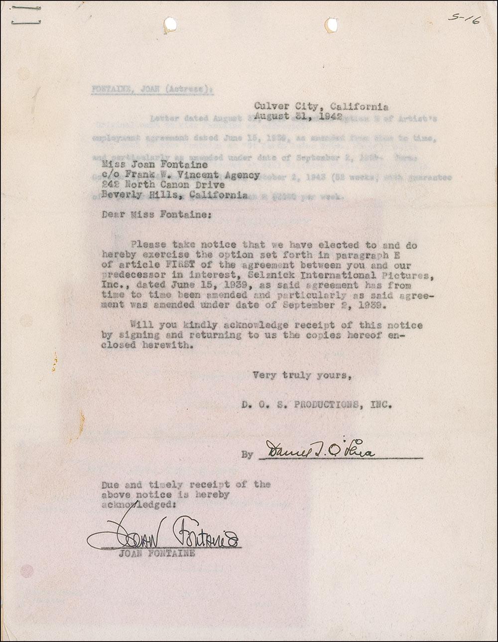 DS, signed “Joan Fontaine,” two pages, 8.5 x 11, August 21, 1942. Addendum contract between Fontaine and David O. Selznick Productions, exercising “the option set forth in paragraph E of article FIRST of the agreement between you and our predecessor…dated June 15, 1939.” Stapled is a page with three return receipts. Wrinkling, scattered soiling, two punch holes at the top and along the left side of the second page, and staples at the upper left corner, otherwise fine condition.