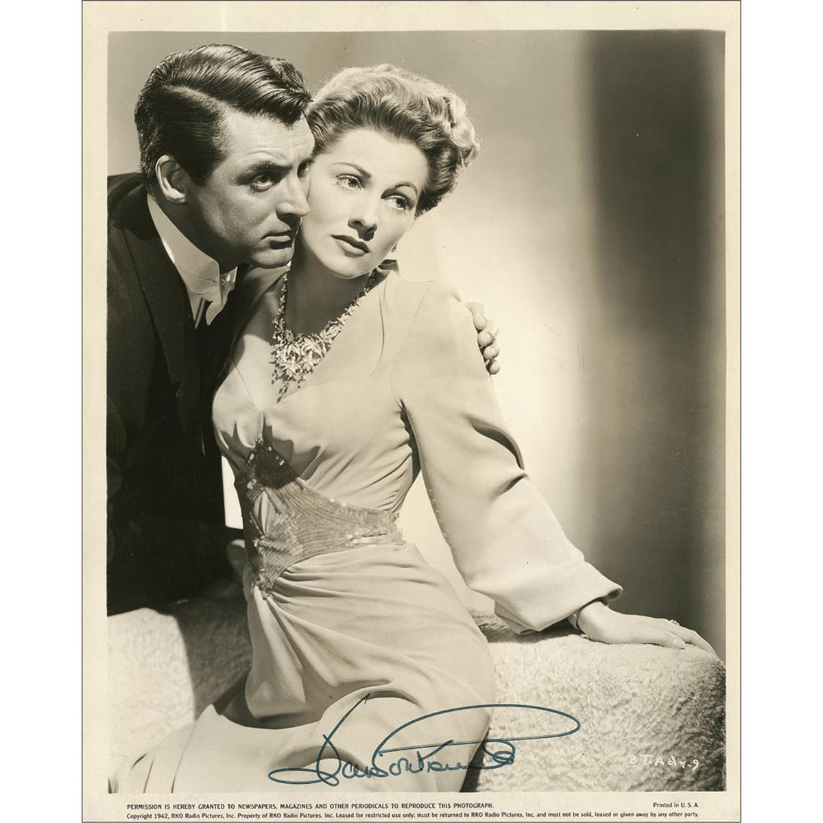 Vintage glossy 8 x 10 heavy stock linen-backed 1942 RKO Pictures publicity photo of Fontaine and Cary Grant from Hitchcock’s classic Suspicion, signed later in black felt tip by Fontaine. In fine condition, with a few scattered edge dings and surface marks.