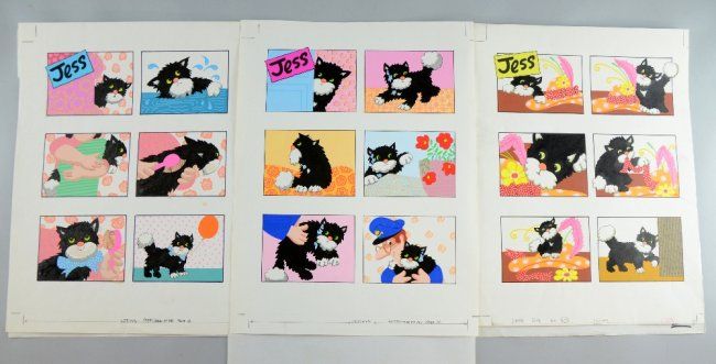 Joan Hickson (1929-) Postman Pat related mixed media drawings of Jess the cat, original artwork on paper, 3 pages each with 6 sketches, annotations to lower margin, each sketch 4 x 5.5 inches, overall 19 x 14.5 inches