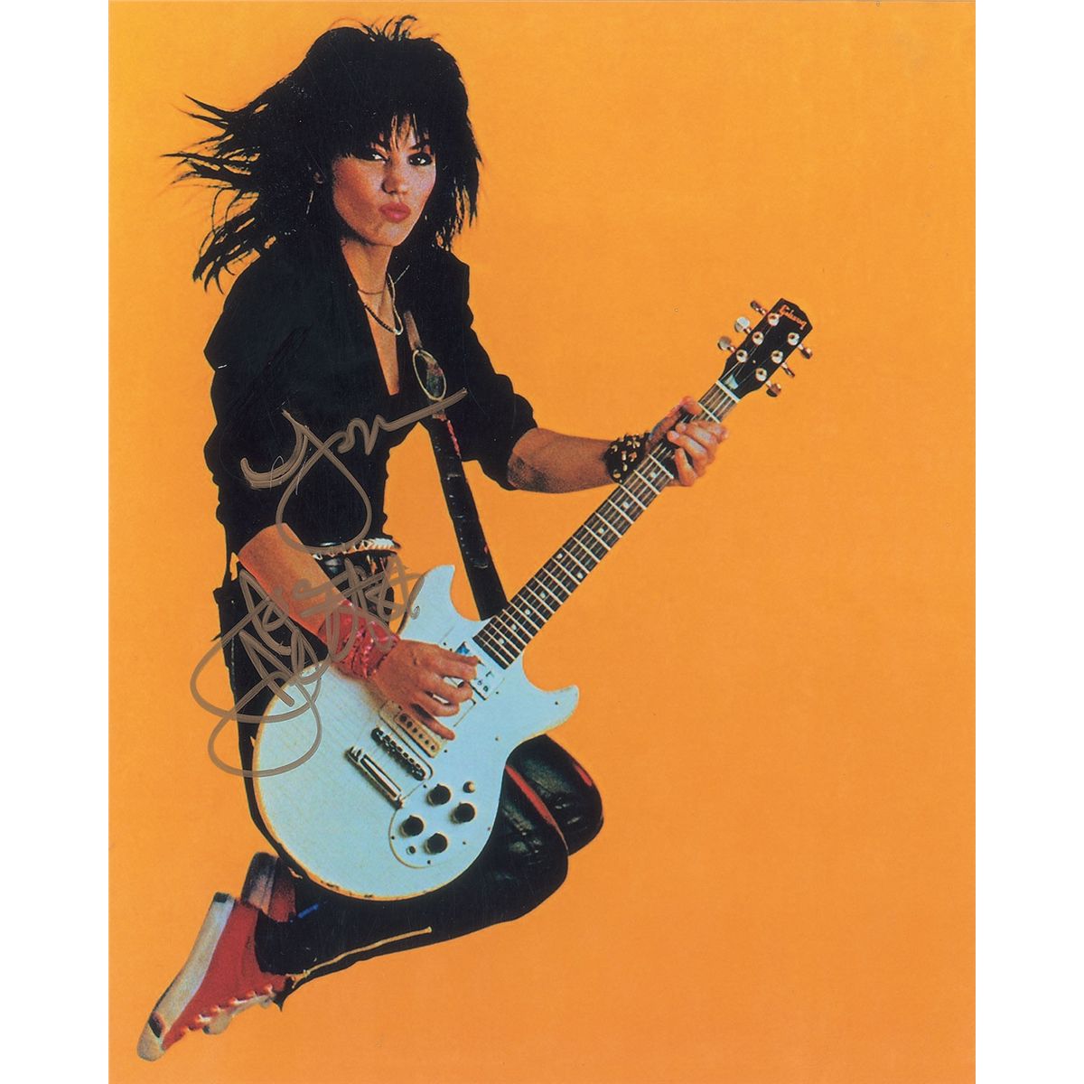 Vibrant color glossy 8 x 9.75 photo of Jett jumping in the air with her guitar, signed in gold ink, “Love, Joan Jett.” In fine condition, with a few surface marks and scuffs (affecting the first letter of “Love”). Consignor notes that the signature was obtained at Cleveland’s Wyndham Hotel during Jett’s goodbye tour.