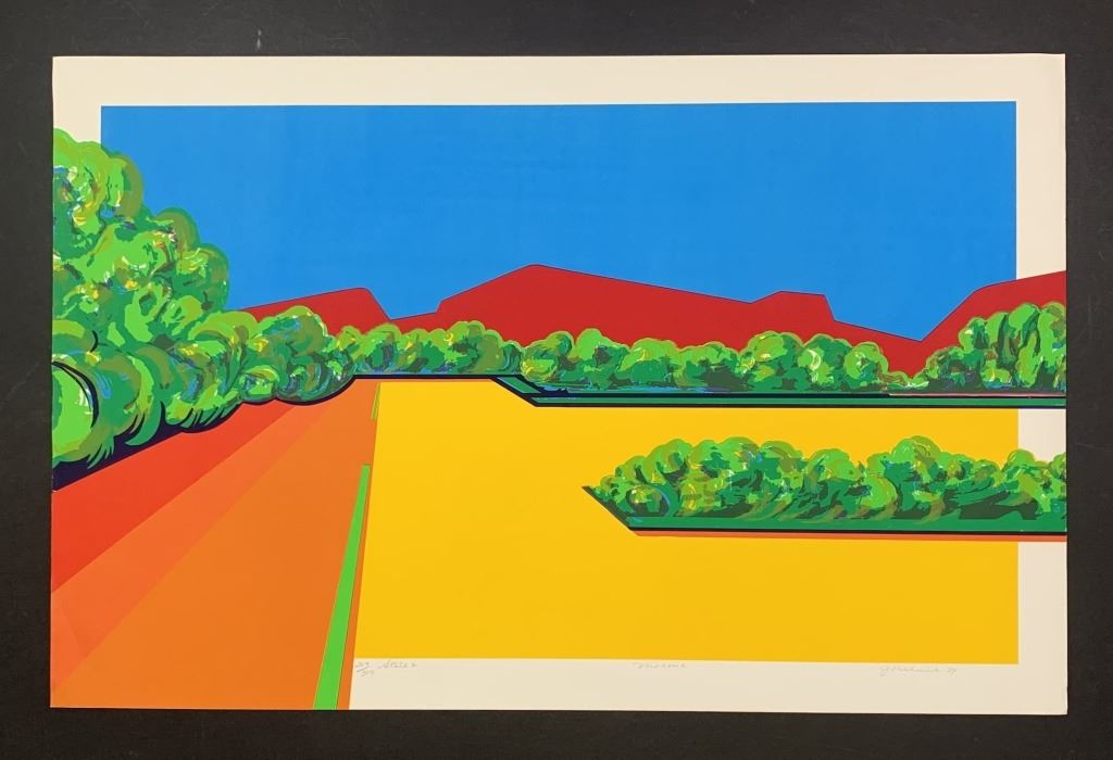Joan Melnick's "Mohonk State 2" limited edition print, signed lower right, and numbered 209/300 lower middle. A very coloruful piece highlighted by green shrubbery. This piece is in excellent condition.