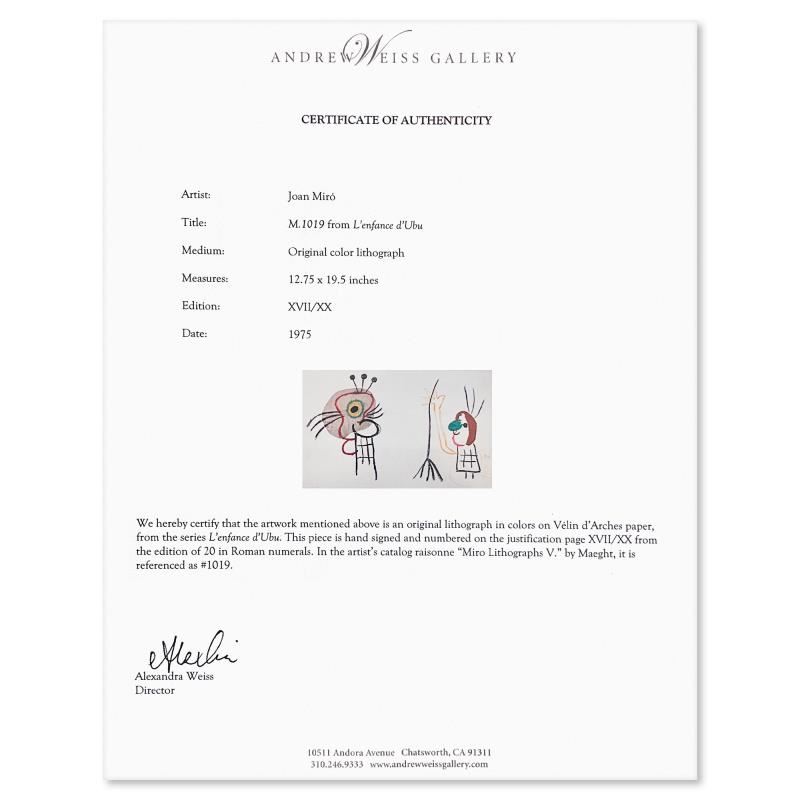 "M. 1019 from L'enfance d'Ubu" is a limited edition lithograph on Velin Arches paper. This piece is hand signed by Joan Miro (1893-1983). The suite portfolio that this piece comes from is numbered but the piece itself is not numbered. This piece comes custom framed. Includes Certificate of Authenticity. Measures approx. 31.5" x 24.5" (frame), 19.5" x 12.5" (image).