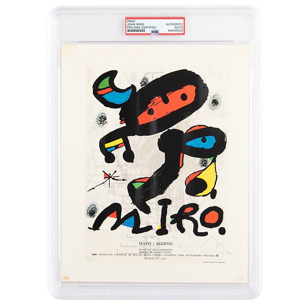 Limited edition color 8.5 x 10.75 print of Joan Miro's poster for an exhibition in homage to the architect Josep Torres Clave, held at the premises of the Colegio in Barcelona from May 15 to June 11, 1980, one of 1000 issued, signed in black ink, "Miro!" In very good to fine condition, with light stains to the corners from old tape remnants to reverse. Encapsulated in a PSA/DNA authentication holder.