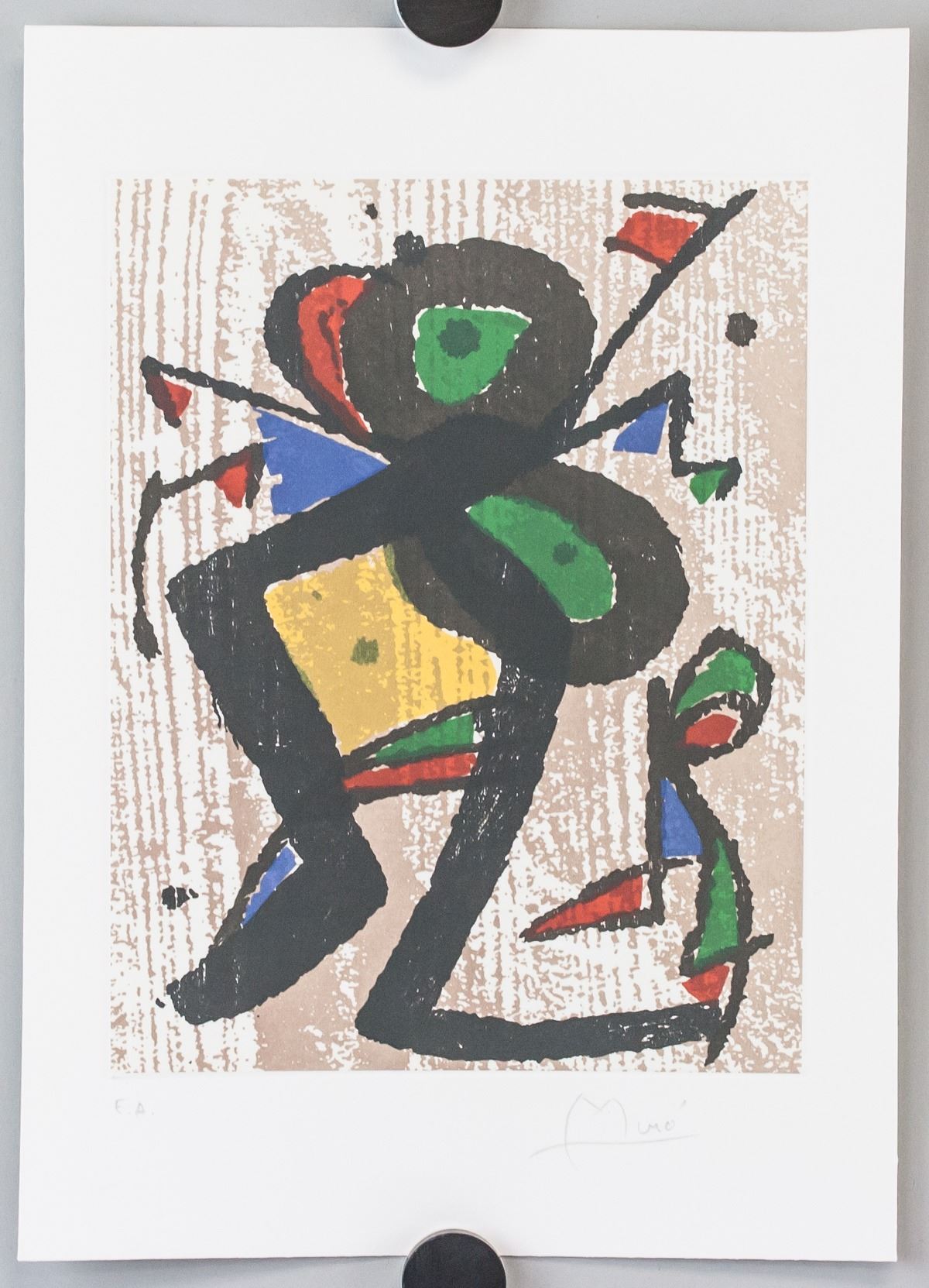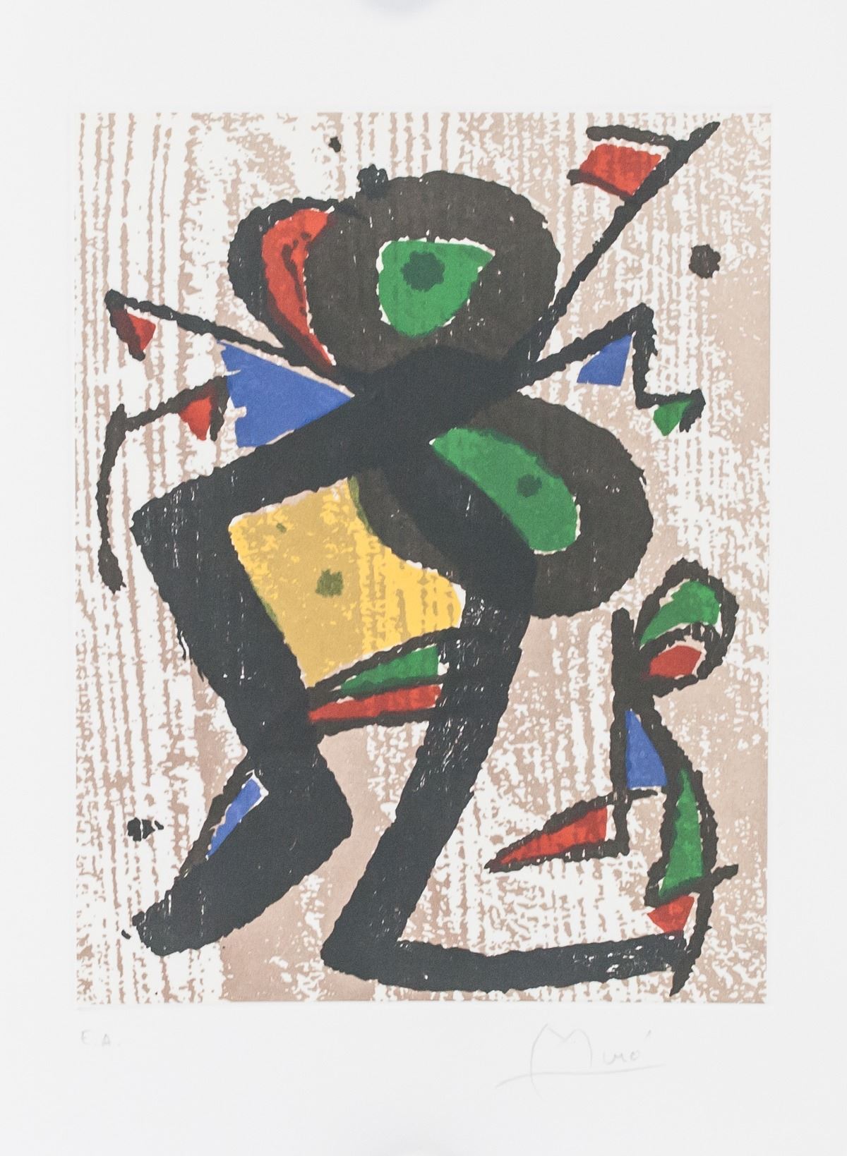 Linocut on paper. Featuring a surrealist composition. Signed Miro and inscribed E.A. on the lower right and lower left corner, respectively. Attributed to Joan Miro (1893-1983, Spanish). Image size: 21 x 16 cm (8.25 x 6.5 inches), sheet size: 29 x 21 cm (11.5 x 8.25 inches). Provenance: This lot carries limited provenance from a Southern Ontario estate