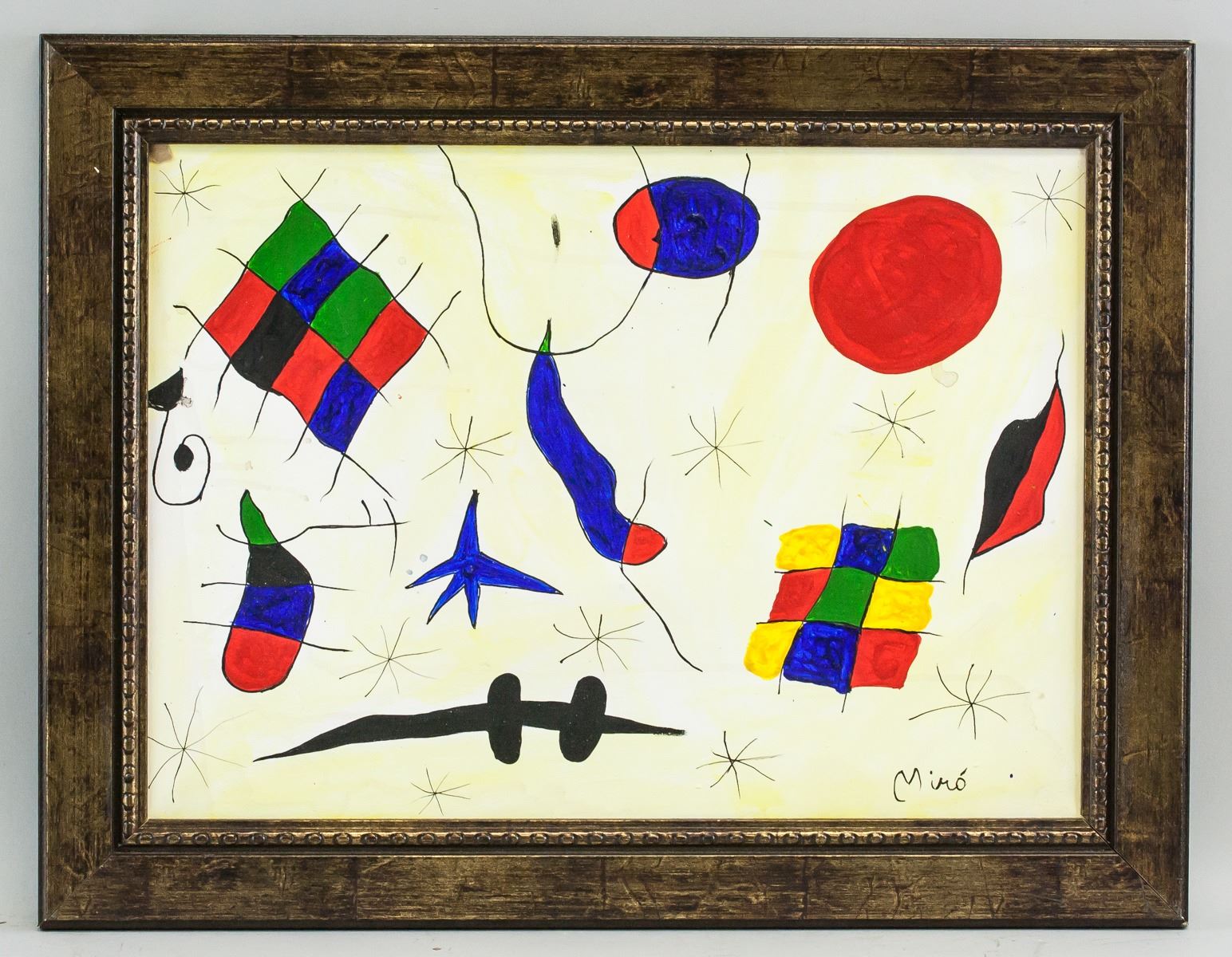 Oil on canvas, framed. Featuring surrealist composition. Signed "Miro" to the bottom right corner. Attributed to Joan Miro (1893-1983, Spanish). 35.5 x 39 cm (14 x 19.5 inch), Frame: 47 x 61 cm (18.5 x 24 inch). Provenance: This lot carries limited provenance from a Southern Ontario estate