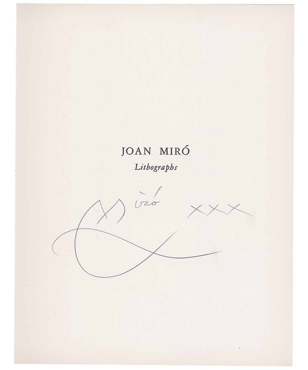 Signed book: Miro Lithographs II. Limited edition of 5000 copies (this being No. 169). NY: Leon Amiel, 1975. Hardcover with dustjacket, 10 x 13, 252 pages. Signed on the half-title page in pencil “Miro xxx.” A huge volume boasting colorful imagery, including eleven beautiful lithographs of Miro’s work, and a large signature. Book condition: NF/VG+. Off-white cloth-covered boards; bump at spinetail (cosmetic only, no damage to binding or textblock). Dust jacket under protective mylar jacket; minimal rubbing. A stunning copy of this highly collectible book.