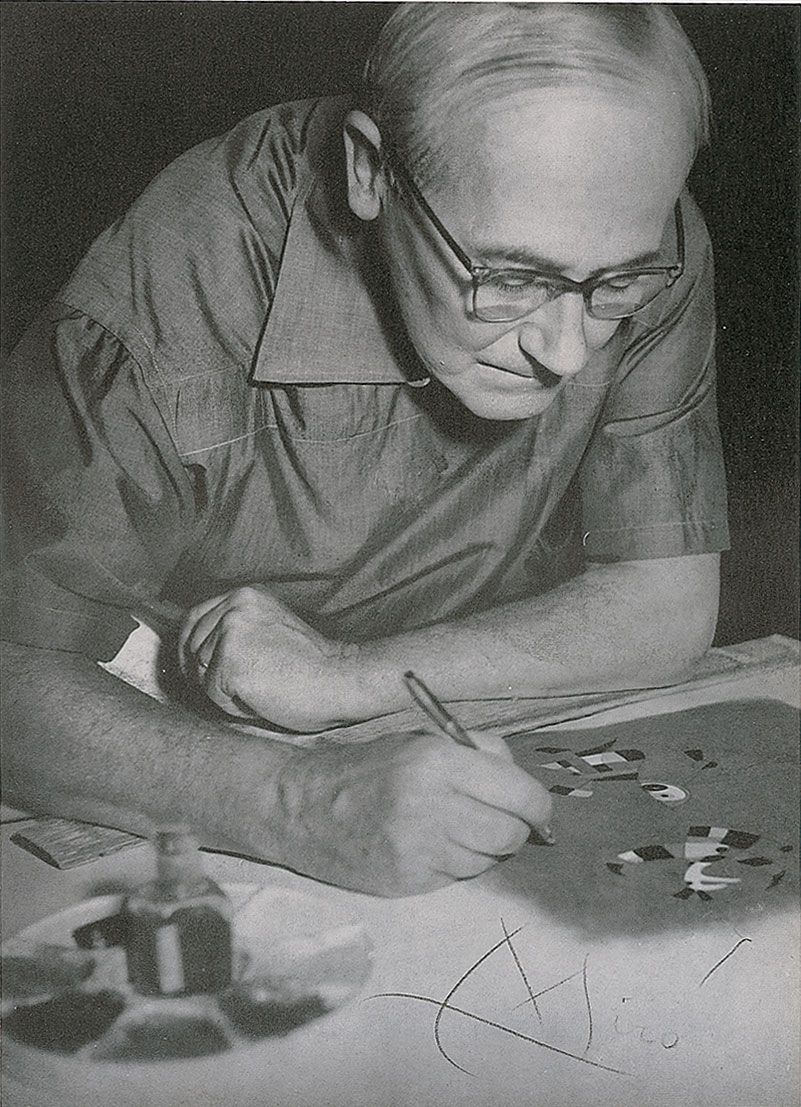Uncommon 6.75 x 9.5 book photo of Miro at work, signed in black artist’s pencil, “Miro.” In fine condition, with portions of the signature a shade light.