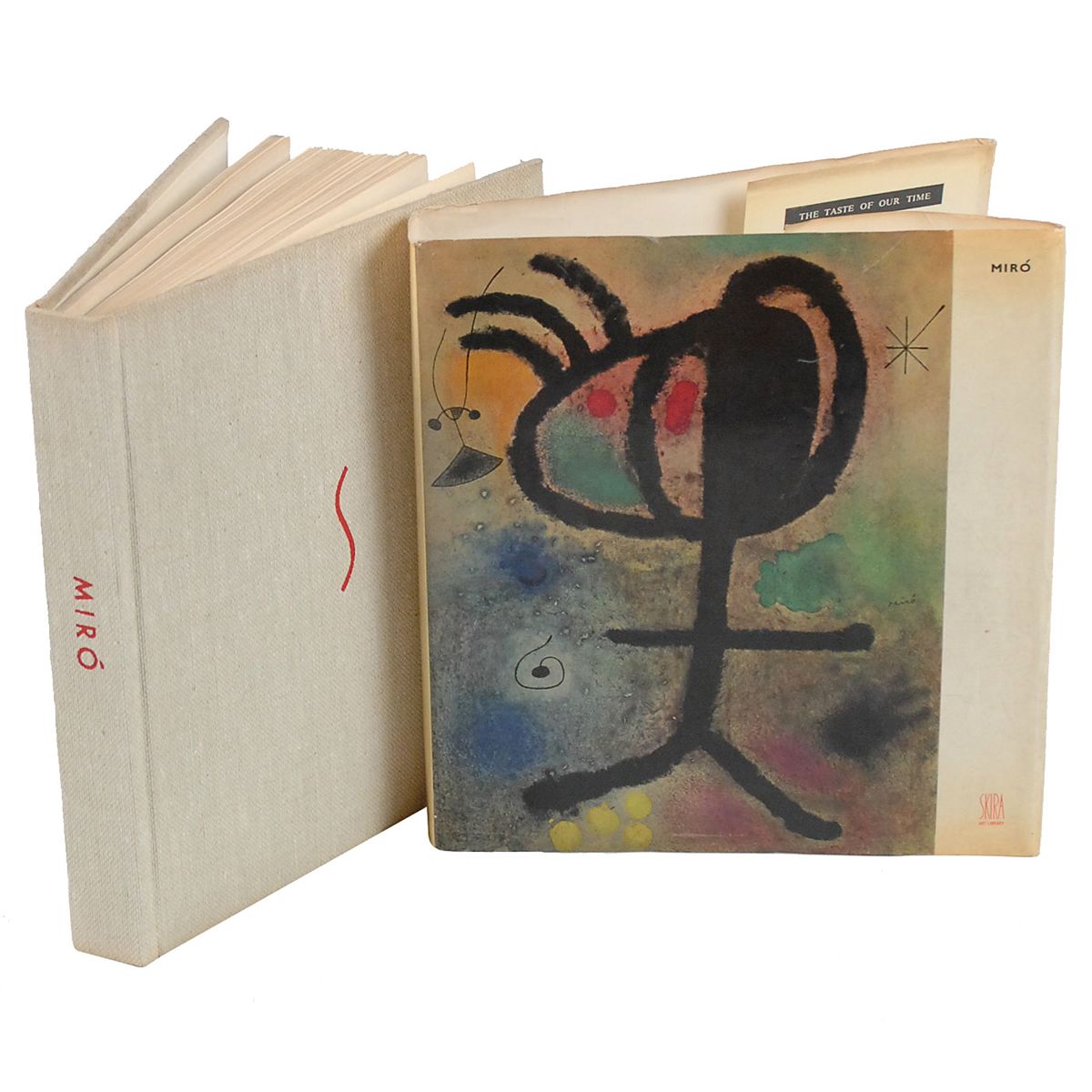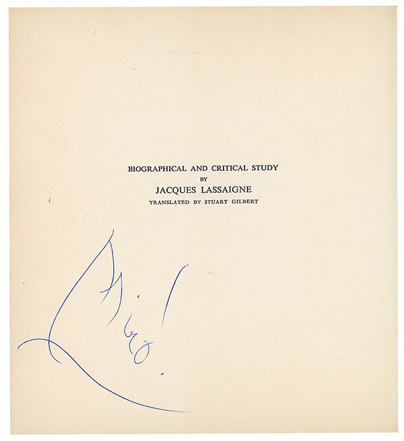 Signed book: Miro. Later printing. NY: Crown Publishers, 1963. Hardcover with dust jacket, 6.75 x 7, 141 pages. Signed on the reverse of the half-title page, “Miro!” Autographic condition: fine. Book condition: G-/VG-. Off-white cloth-covered boards; minor soiling and discoloration to edges; textblock entirely separated from spine and split into several pieces (all pages present). Dust jacket has some small tears and creases to edges; heavy sunning/yellowing; and slight rubbing and soiling.