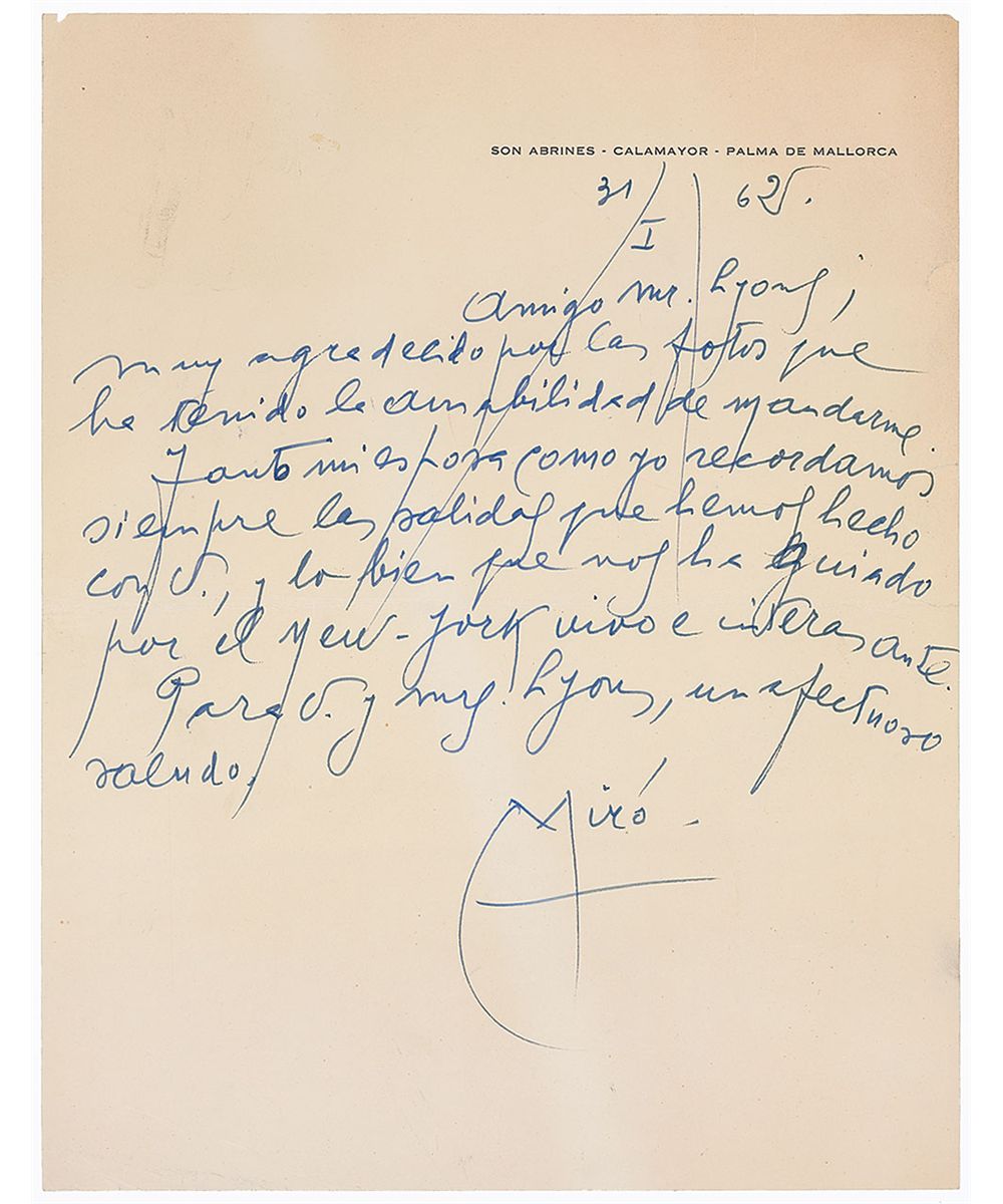 ALS in Spanish, signed “Miro,” one page, 8.5 x 11, personal letterhead, January 31, 1965. Letter to New York Post columnist Leonard Lyons, renowned for his syndicated column ‘The Lyons Den.’ In part (translated): “I am very grateful for the photos that you have been kind enough to send to me. Both my wife and I are reminded of going out with you, and how well you guided us through the lively and interesting New York.” In fine condition. Accompanied by a mailing envelope from a later letter to Lyons addressed in Miro’s hand.