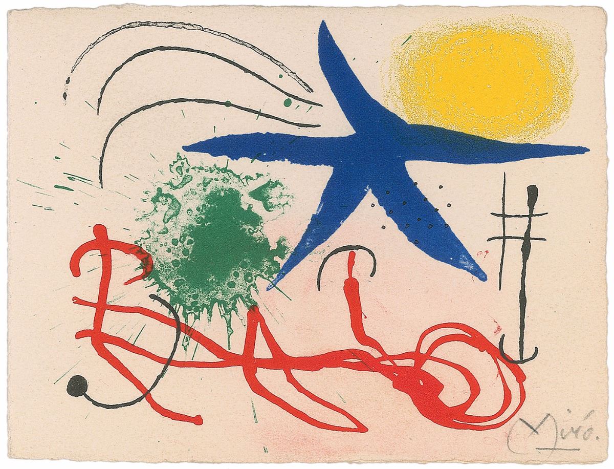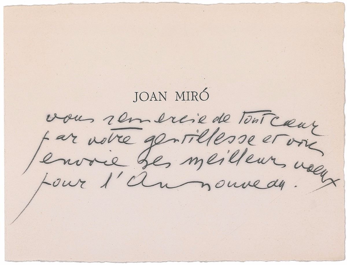 Fantastic card featuring a colorful print of one of Miro’s artworks, measuring 5.5 x 4.25, signed on the front in pencil, “Miro,” with an untranslated note in French penned inside by Miro. In fine condition.