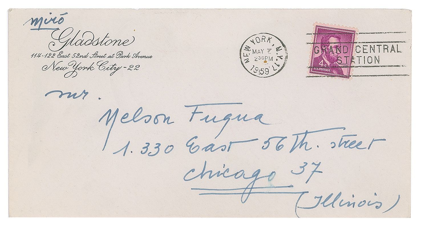 ALS in French, signed “Miro,” one page, 7.25 x 10.5, Gladstone letterhead, April 6, 1959. Letter to Nelson Fuqua in Chicago, in part (translated): "My dear friend, I am deeply touched by all you did for us in Chicago. I was quite distressed by this stay in America and overwhelmed by everything you did to keep the project in New York…Right now my wife and I are in Chicago. We look forward to seeing you in Paris in early June. Thank you again from the bottom of my heart." In fine condition. Accompanied by the original mailing envelope addressed in Miro's hand, incorporating his surname in the return address area. Accompanied by an export certificate from the French Ministry of Culture.