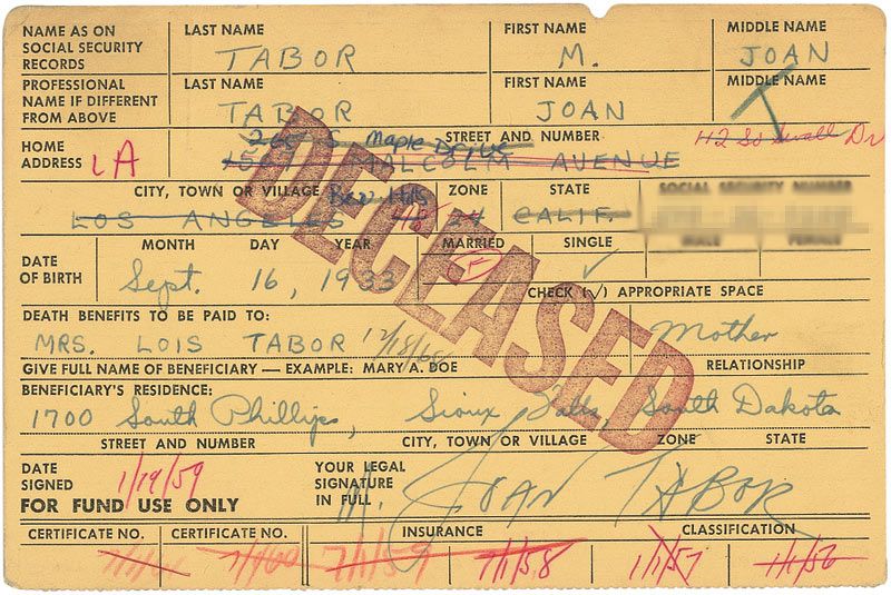 American actress (1932–1968), with numerous TV appearances in the 50s and 60s including Mister Ed, Bat Masterson, and Perry Mason. She had a tumultuous relationship with husband Broderick Crawford and died quite young, at the age of 36, after accidentally overdosing on influenza medication. Tabor’s rare yellow AFTRA union P&W benefits card, one page, both sides, 6 x 4, dated January 1, 1959. Pension and Welfare benefit card is filled out, most likely in Tabor’s hand, listing her full name, LA address, birthdate, and Social Security number. Signed at the bottom in blue fountain pen “Joan Tabor.” On the reverse, she lists her daughter and on the front her mother, as recipients of her death benefits. Stamped across the front of the card is “Deceased.” Several office notations, including the address being crossed out, aforementioned stamp, perforated bottom edge, and tiny partial punch hole to top edge, otherwise fine condition.