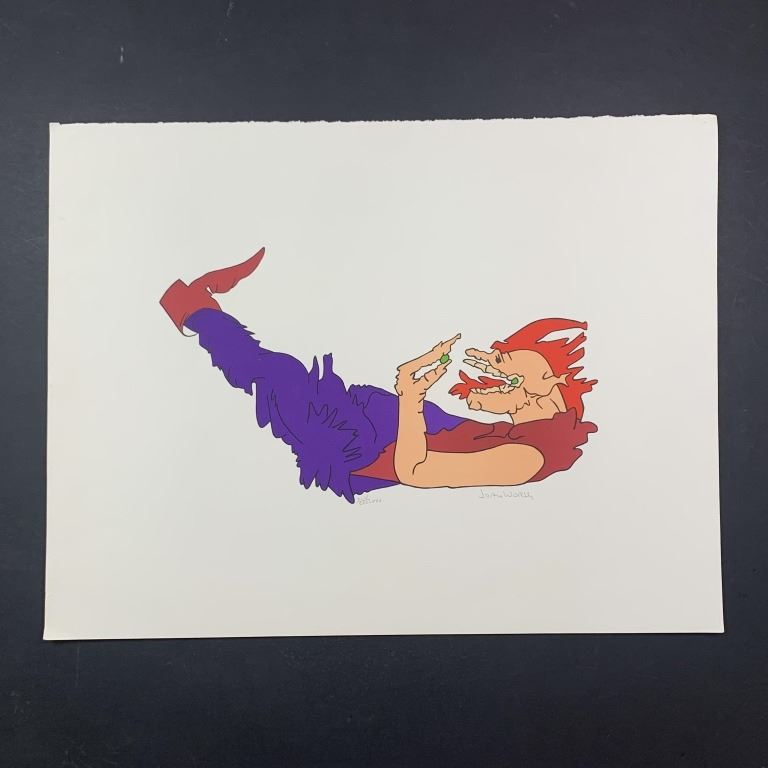 Joan Worth's "Punk Rocker - Red Mohawk" limited edition print, signed lower right, and numbered CLV/CCCLXXV lower left. This piece is of a punk rocket with a red mohawk, lying down, about to eat a pea. This piece is in near excellent condition with a light vertical crease from top to bottom at left, and a crease upper left corner.