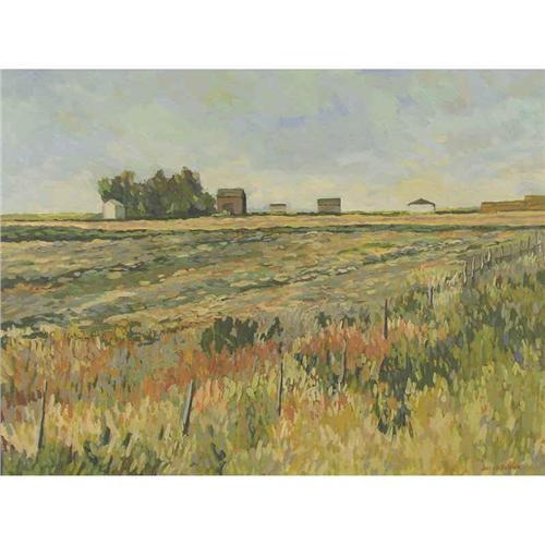 [Canadian ASA b. 1928] FARM ON CREST OF HILL BESIDE HOLSOM RD. MEDICINE HAT; 1977 Oil on board 18 x 24 in.