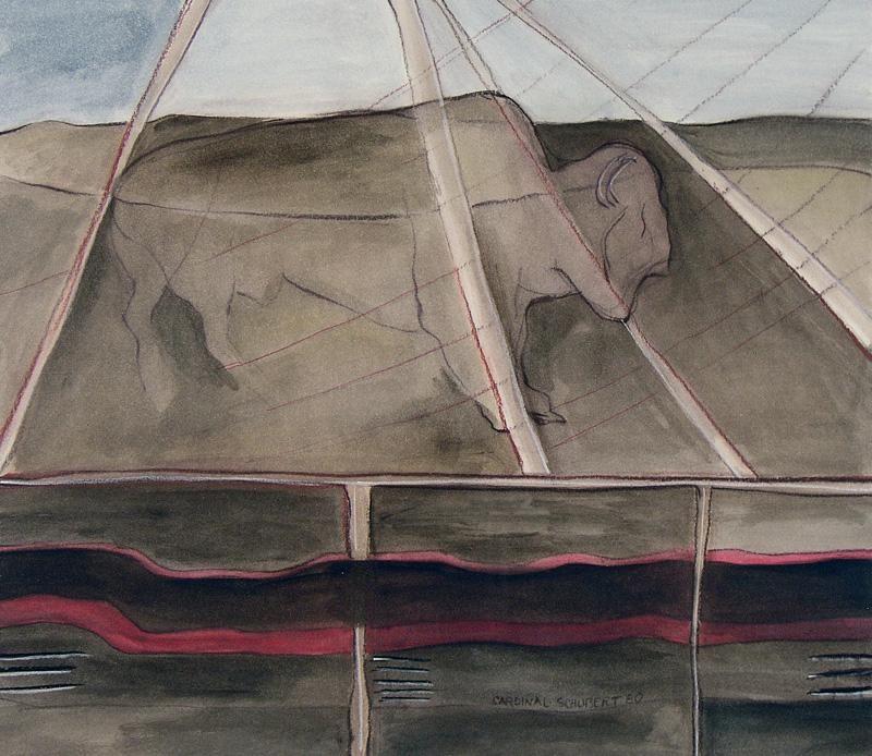Canadian ASA, RCA [b. 1942] BUFFALO LODGE; 1980 mixed media on paper 13.75 x 15.75 in. (35 x 40 cm) signed, titled & dated Provenance: Estate of Helena Hoogerheide, Calgary