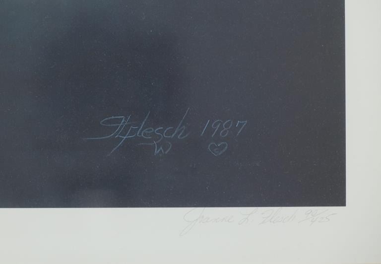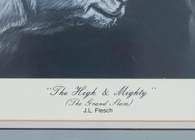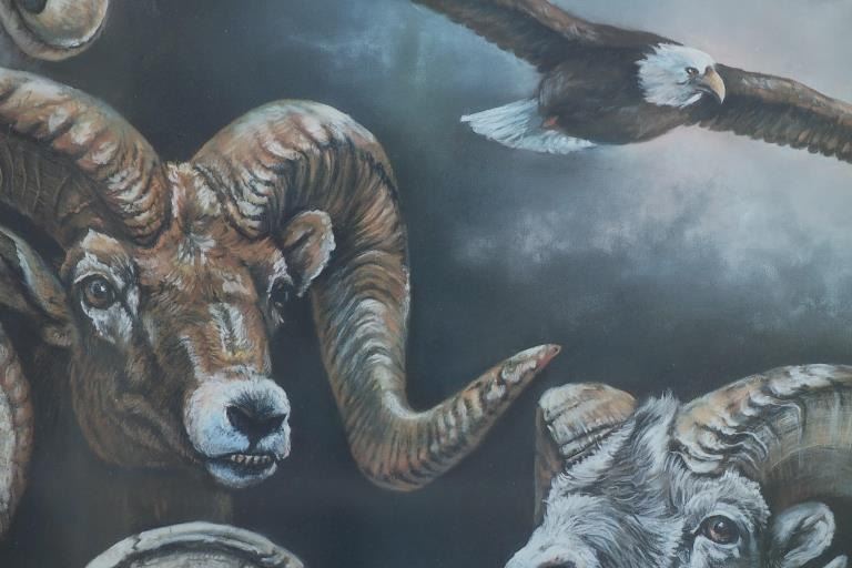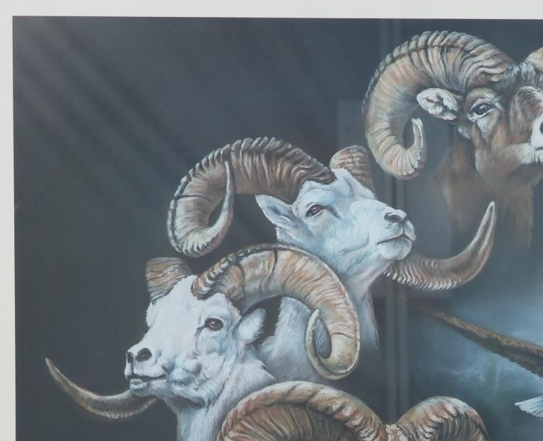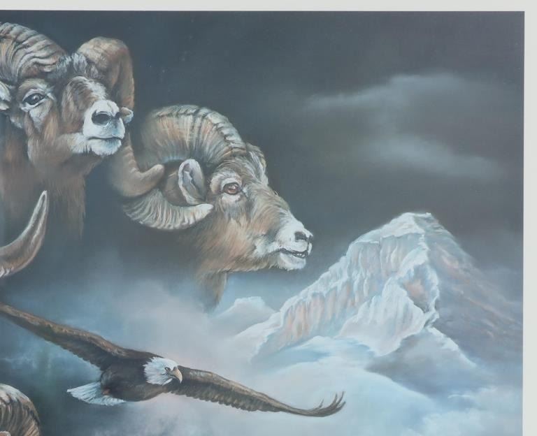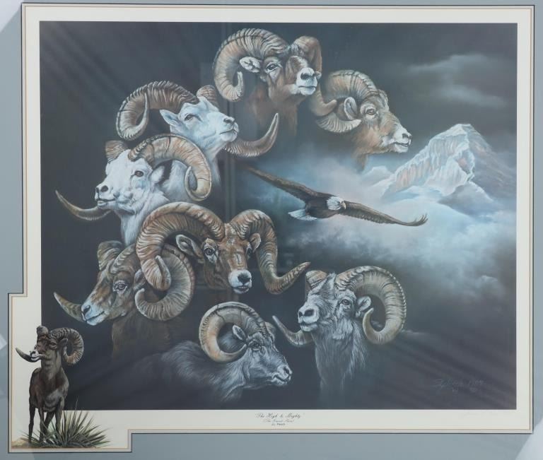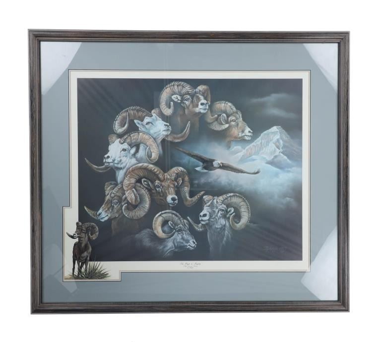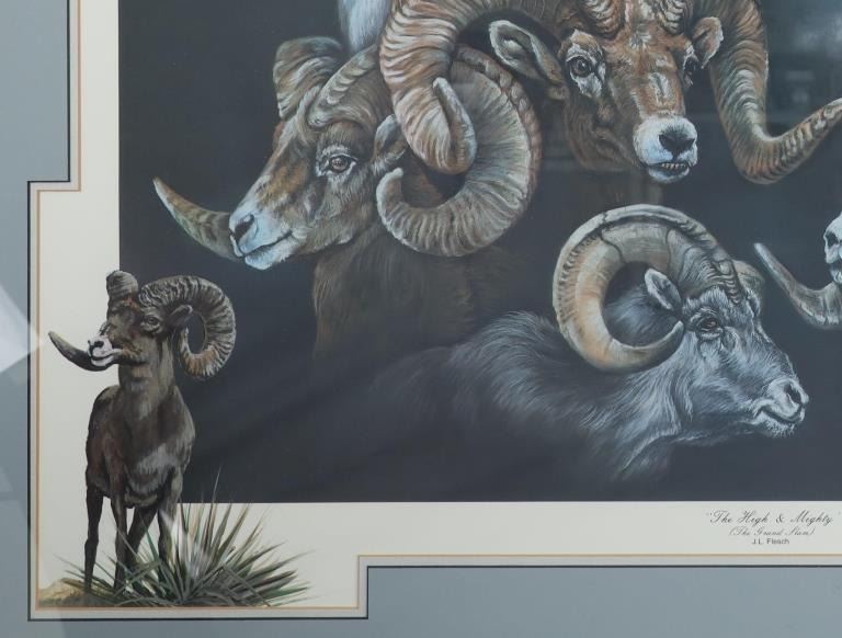 For your consideration is this limited edition (90/425) framed print done by Montana artist Joanne L. Flesch titled, "The High & Mighty (The Grand Slam)" circa 1987. The print shows a collage like scene with various big horn sheep heads throughout the artwork, mountains in the background and an eagle soaring over head on the right hand side. In the bottom left hand corner is a painted big horn sheep done for the limited edition release for the print. The bottom reads, "The High & Mighty (The Grand Slam) J.L. Flesch" and in pencil it reads, "90/425 Joanne L. Flesch". The piece is set in a wood frame and is doubled matted with off-white matting paper and gray matting paper. The visible art measures 24 3/4" L x 29 1/4" W, while the entire piece measures 33 7/8" L x 38 1/4" W x 1 1/4" D. It has a total weight of 16 pounds and 10 ounces.