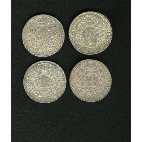 <B>Joao VI - Quartet of Overstruck 960 Reis, </B></I>1818R over Lima 8 Reales 1800, 1818R over Mexico 1814 8 Reales, 1819R over undetermined Ferdinand VII 8 Reales and 1819R over a Lima 8 Reales of Ferdinand VII. All four coins are nicely toned XF-AU. <B>Sold as is, no return lot.</B></I><BR><BR><b>Shipping:</b> Coin/Currency (<a target="_blank" href="http://www.heritageauctions.com/common/shipping.php">view shipping information</a>)