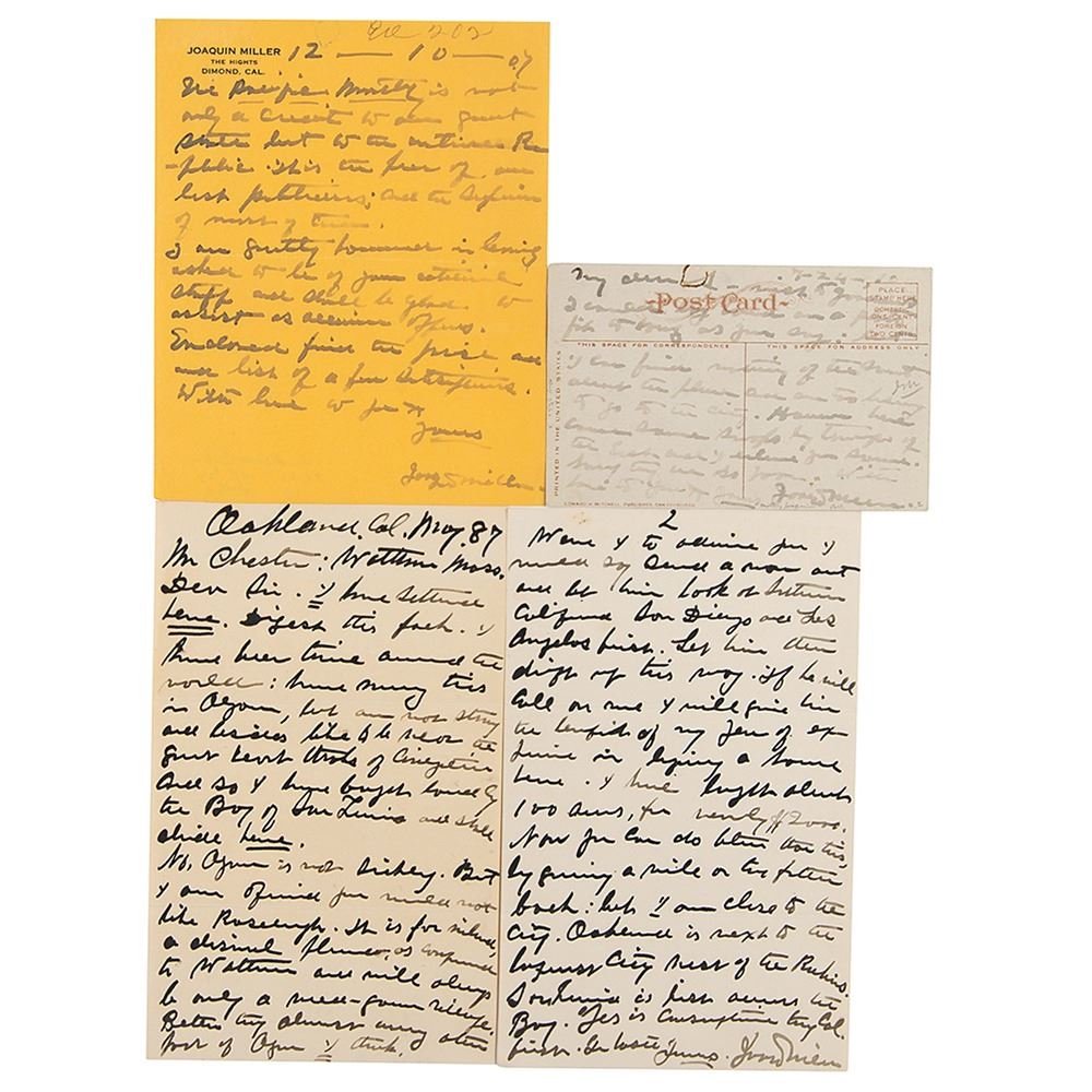 Pen name of the colorful American poet, essayist, and fabulist Cincinnatus Heine (or Hiner) Miller (1841-1913), nicknamed the 'Poet of the Sierras.' Nice grouping of three ALSs by Joaquin Miller, including a two-page handwritten letter from 1887, a one-page handwritten letter from 1907, and a postcard. The highlight is the earliest letter, written from Oakland, which he emphatically opens with "I have settled here," twice underlining both "I" and "here." In overall fine condition, with a bit of mounting residue to one corner on the front of the postcard, and uniform fading to the postcard's writing.