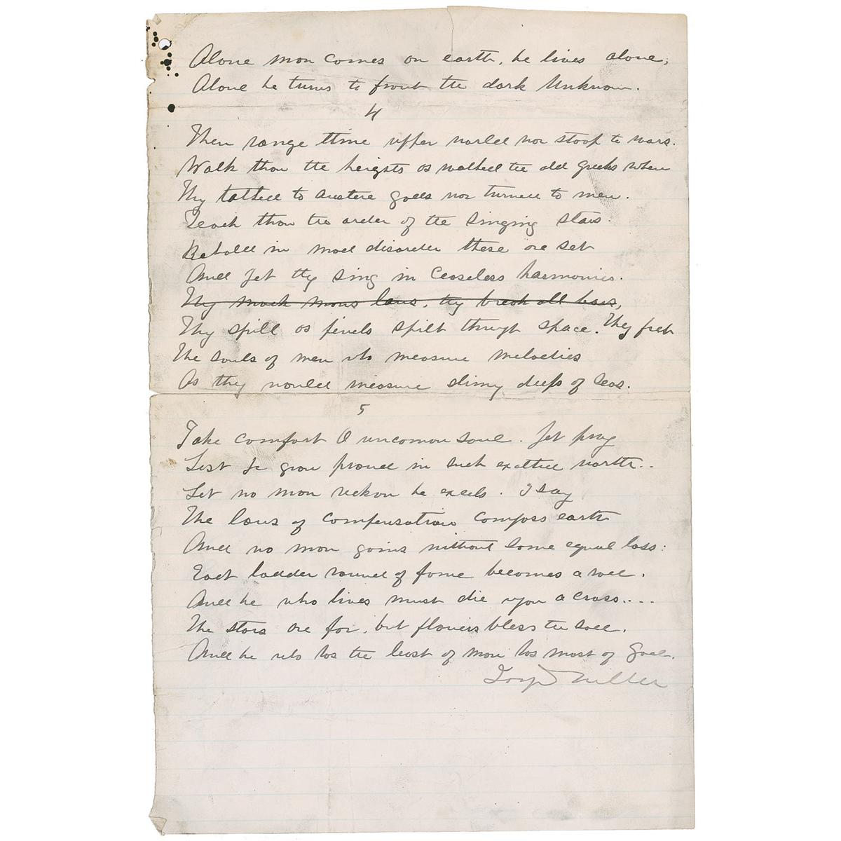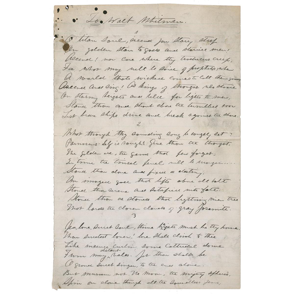 Pen name of the colorful American poet, essayist, and fabulist Cincinnatus Heine (or Hiner) Miller (1841-1913). Original handwritten and signed poem entitled ‘To Walt Whitman’ on two 7.75 x 11.75 lightly-lined off-white sheets. This poem was originally published in the January 1877 edition of Galaxy magazine, and is the actual manuscript that was submitted to the magazine. The five-stanza poem begins:
