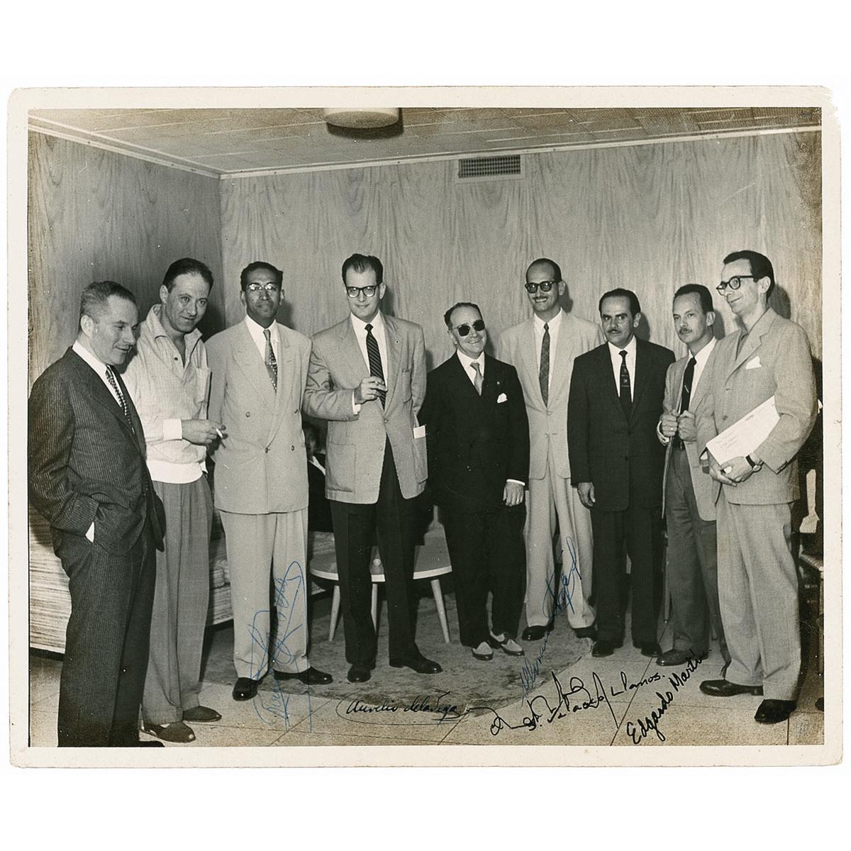 Composer of classical music and a virtuoso pianist (1901-1999). Despite being nearly blind from an early age, he achieved great success. Vintage glossy 10 x 8 photo of Rodrigo surrounded by a group of composers, signed in black ink by Rodrigo and also signed by five others in the photo, including Cuban composers Edgardo Martin and Aurelio de la Vega. In very good condition, with scattered creases and surface marks, dings and slight paper loss to right edge, and light curling to vertical edges.