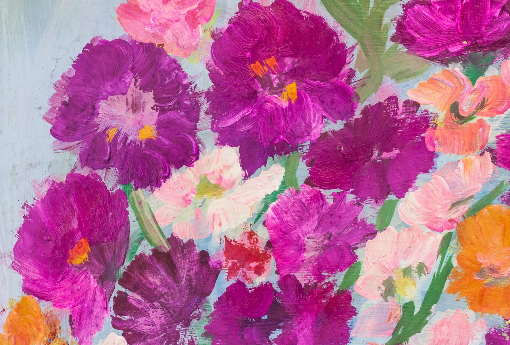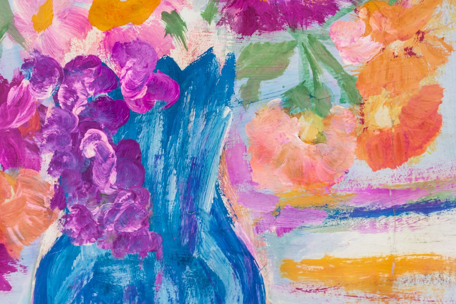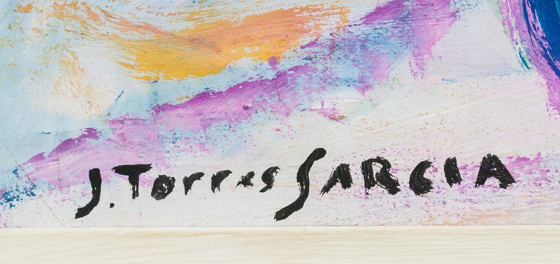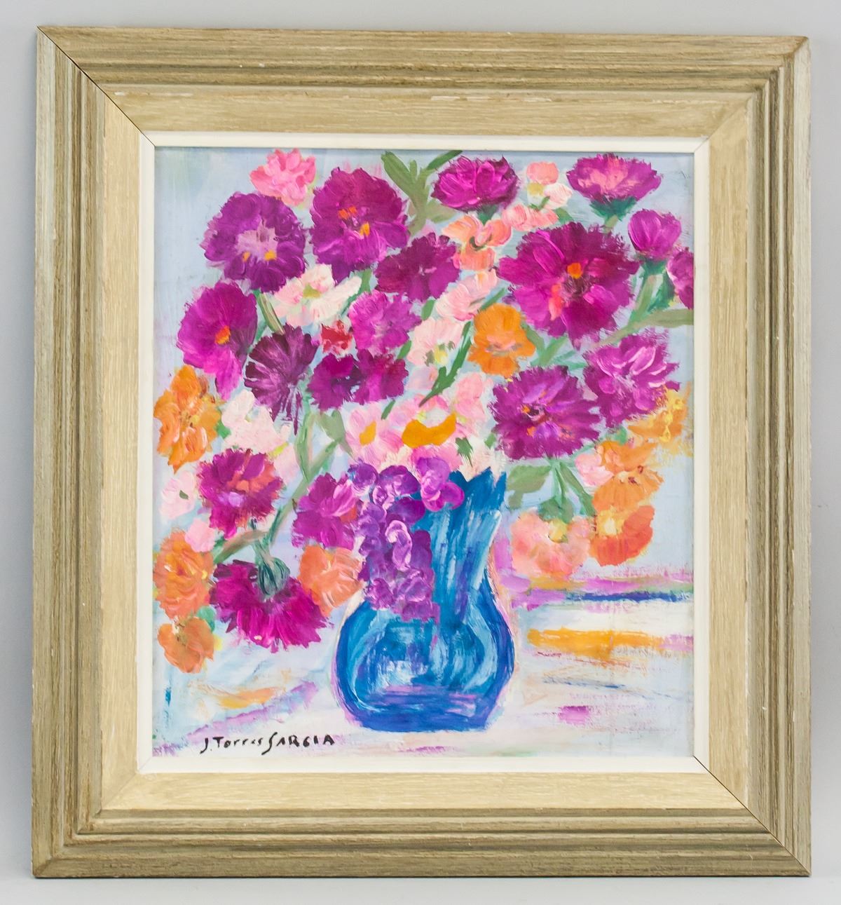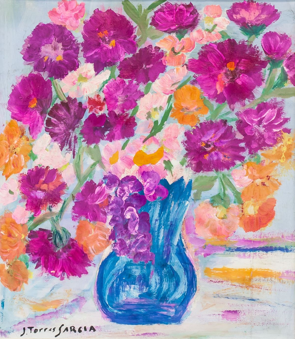 Oil on canvas, framed. Featuring still-life of a colorful bouquet of flowers in a blue vase. Signed "J. Torres Garcia" in the bottom left corner. "Bought 1960 at Grimsky Auction" inscribed on frame on verso. Attributed to Joaquin Torres-Garcia (1874-1949, Uruguayan). Canvas: 47 x 42 cm (18.5 x 16.5 inches). Frame: 64 x 58.5 cm (25 x 23 inches). Provenance: This lot carries limited provenance from a Southern Ontario estate.