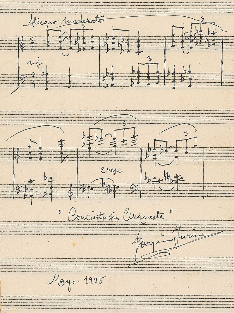 Spanish composer of classical music (1882–1949). AMQS on a 4.5 x 6 sheet of musically-lined paper. Turina pens six double bars from his work entitled ‘Concierto sin Orquestra (Concerto without Orchestra),’ notated at the top, “Allegro Moderato,” and signed at the bottom, “Joaquin Turina, Mayo 1935.” In fine condition.