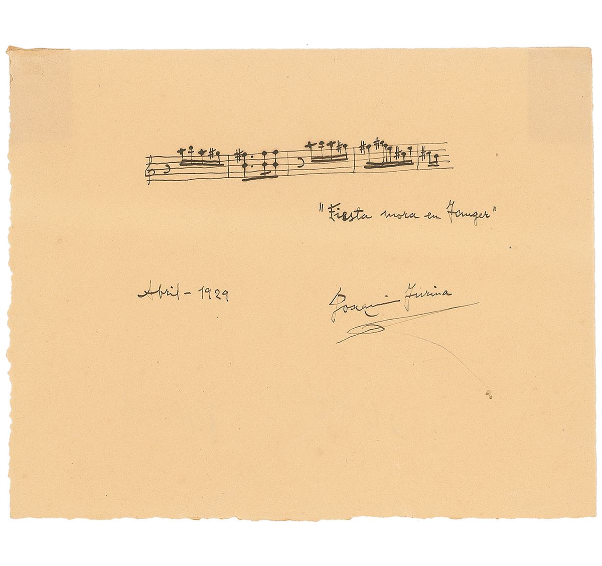 Spanish composer of classical music (1882–1949). AMQS on an off-white 6.5 x 5.25 sheet, signed below, “Joaquin Turina, April–1929.” Turina crisply pens five bars he identifies as “Fiesta mora en Tanger.” In fine condition, with a few light scattered creases.