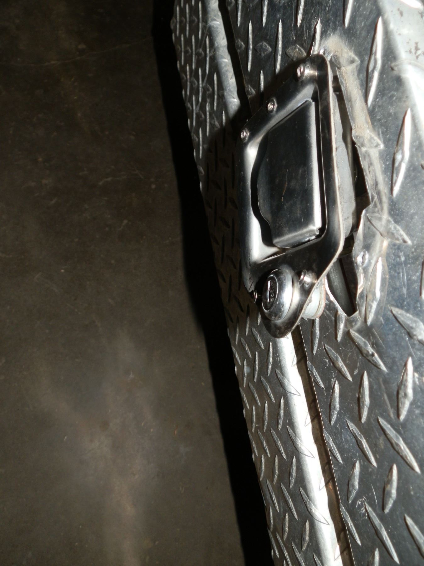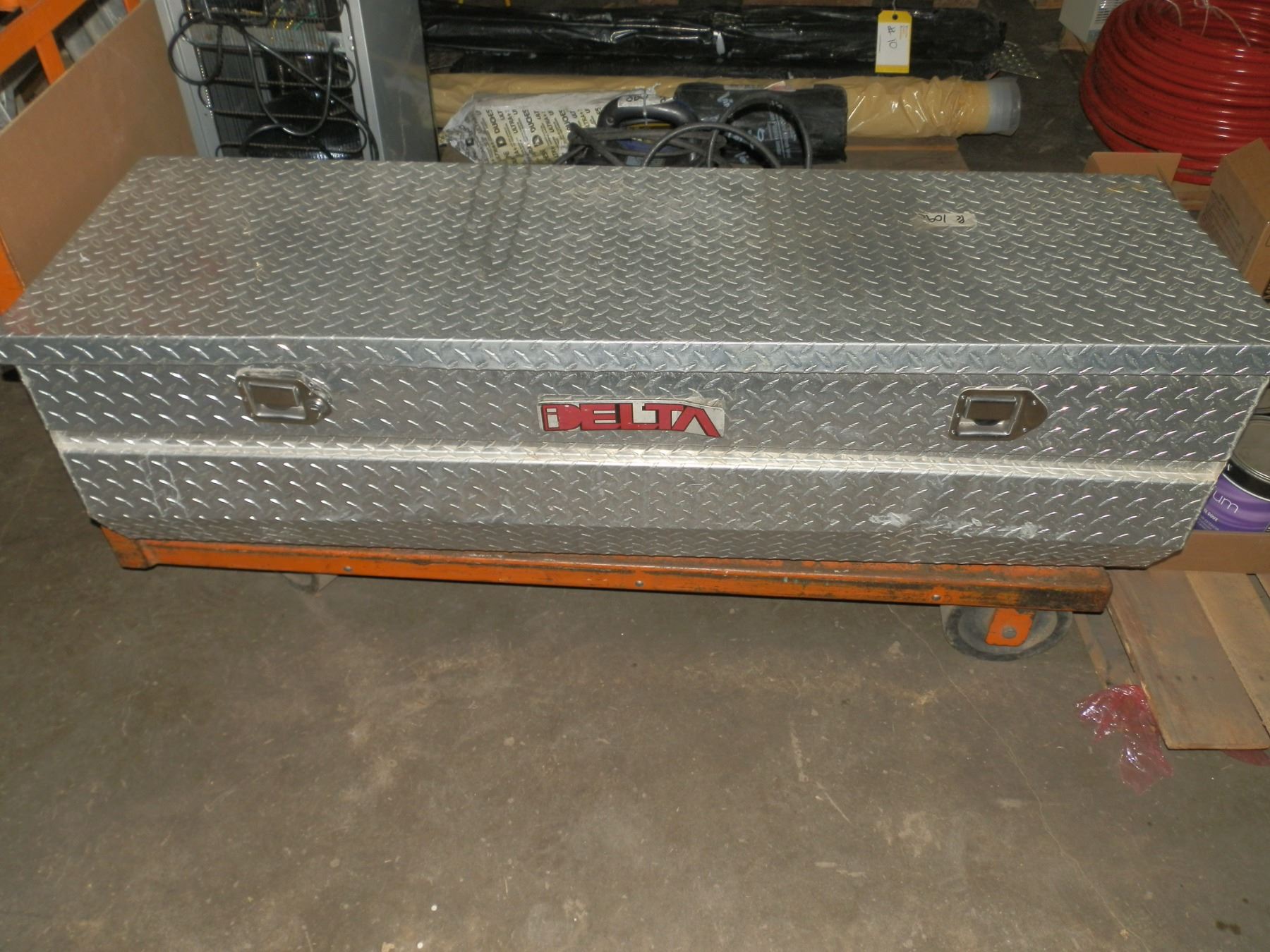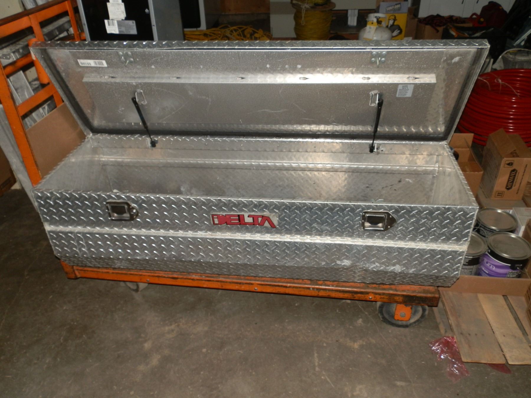Checker Plate Job Box, one latch needs a minor fix, no keys, in good condition, 59"L 20"W 16"H...used