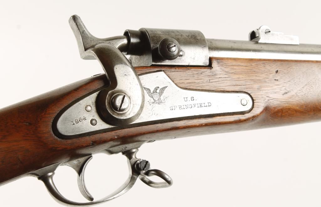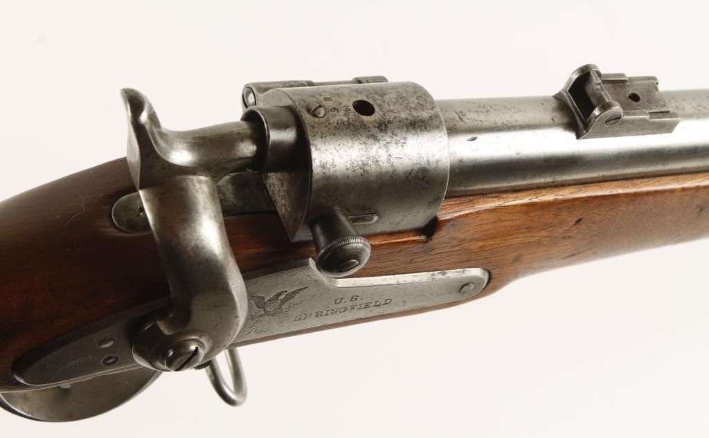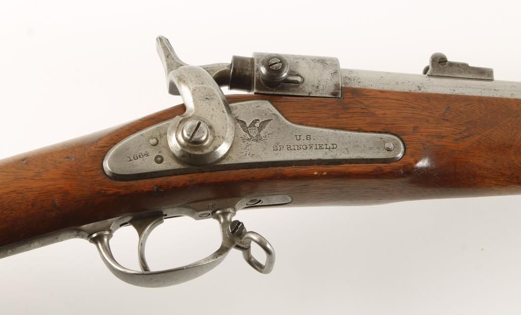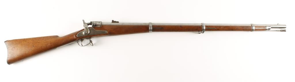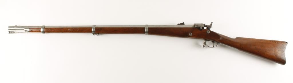 Breechloading conversion rimfire rifle made in about 1864. Considered to be the first true breechloading rifle of the Civil War. Lock is Springfield marked with 1864 date, 35-1/2" barrel with 3 barrel bands and full length walnut stock. Good bore and action. Condition: Very good showing light cleaning of the metal and wood is excellent. *Antique Firearm*