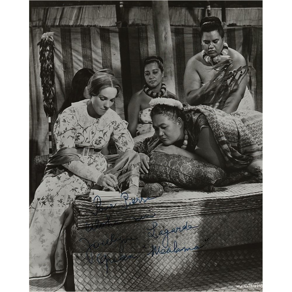 Rare vintage glossy 8 x 10.25 photo of a scene from Hawaii, signed and inscribed in fountain pen, "Pour Pierre, Aloha niu, Jocelyne Lagarde, 'Queen Malama.'" In fine condition.