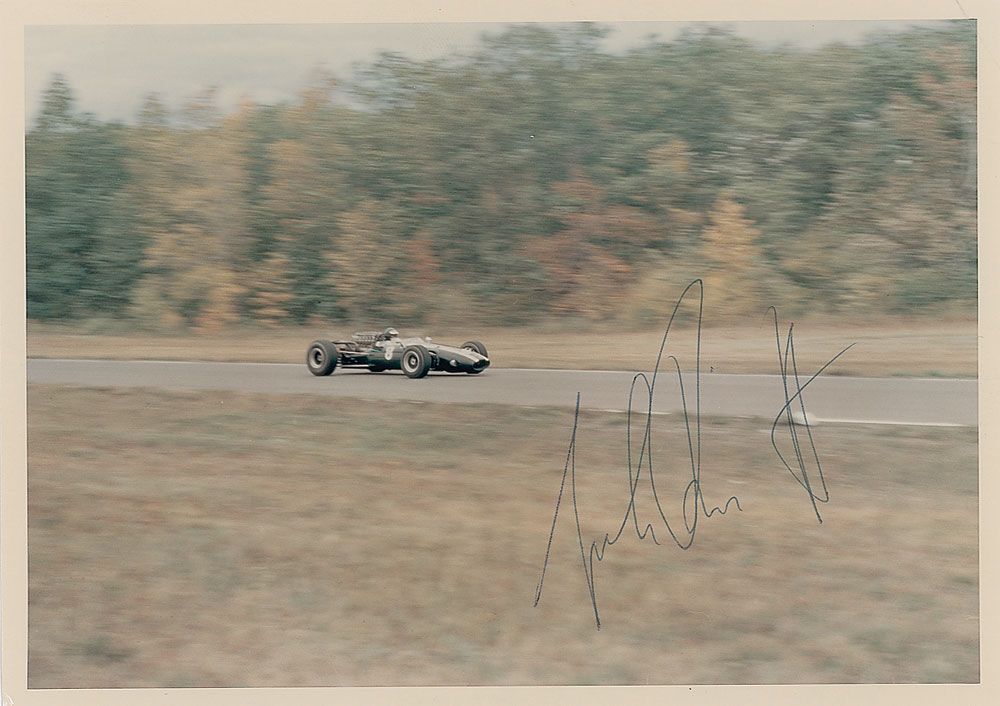 German race car driver (1942–1970) who is the only driver to posthumously win the Formula One World Drivers' Championship, after being killed in practice for the Italian Grand Prix. Vintage color 7 x 5 candid photo of Rindt in his race car, signed in black ballpoint. Photo is labeled on the reverse in pencil in an unknown hand, “1966 GPUS.” In fine condition. Accompanied by a letter of authenticity from James Spence.