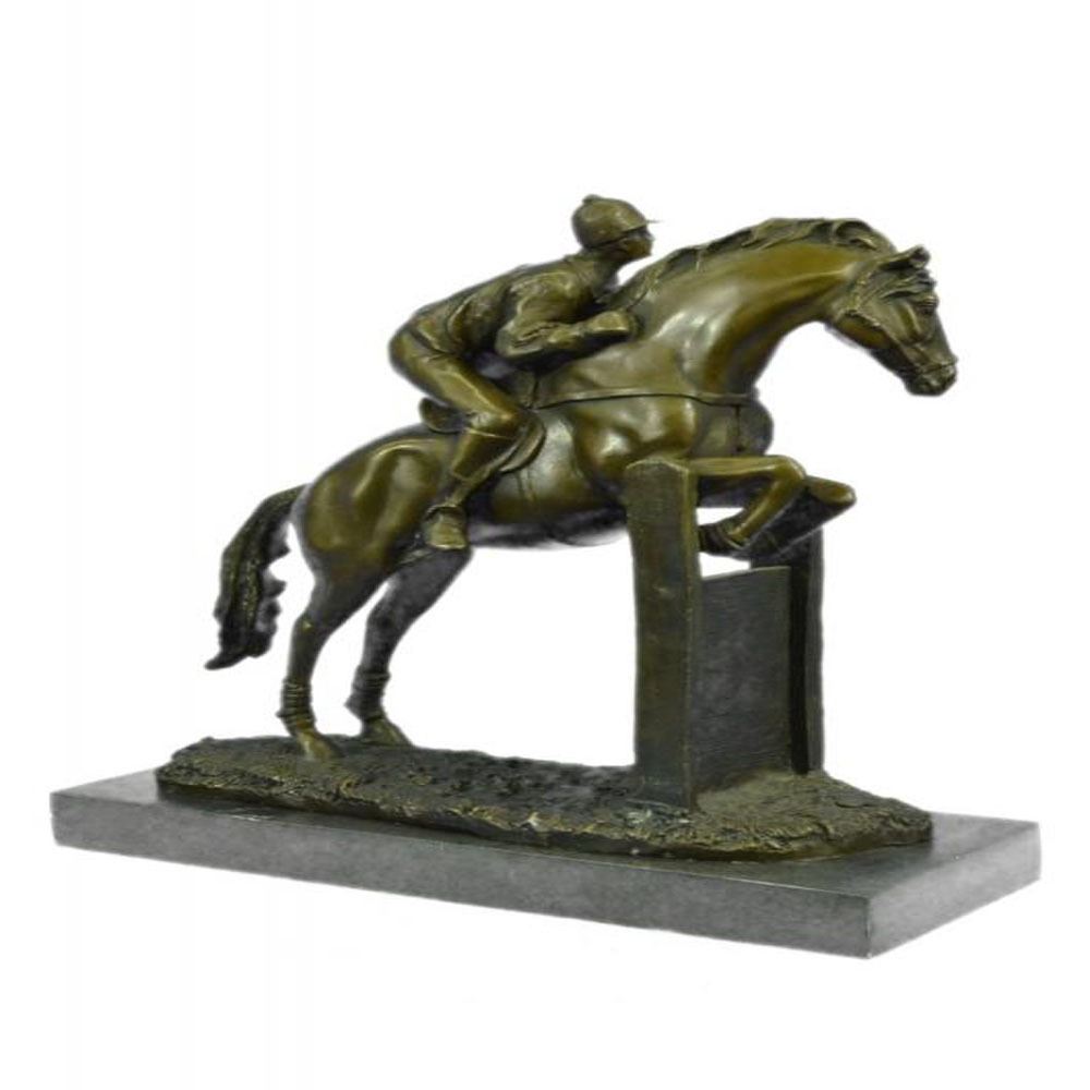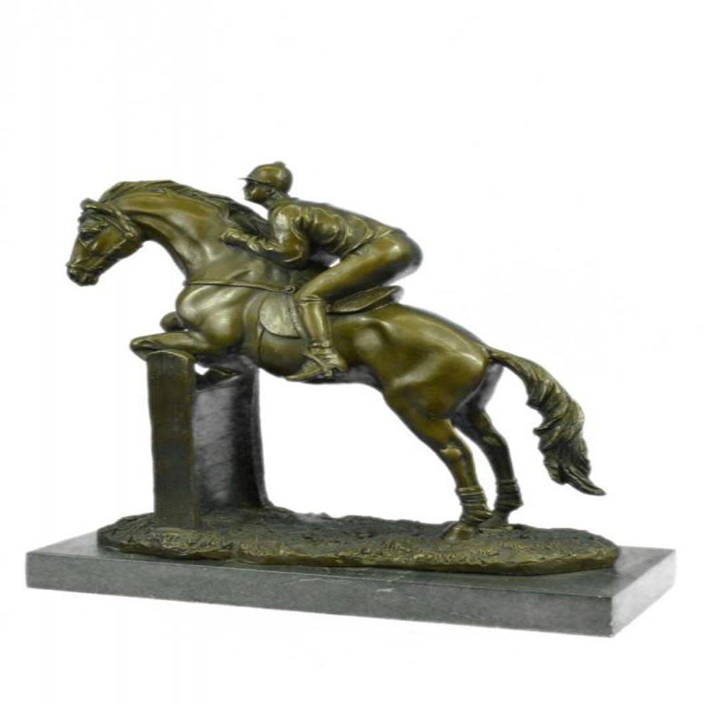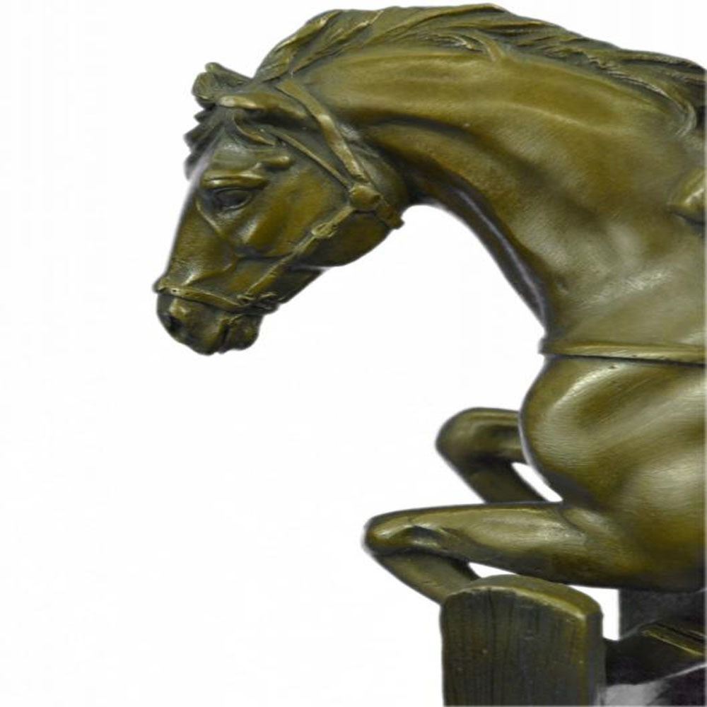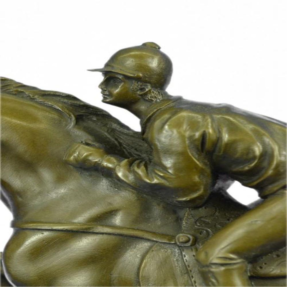This thoroughbred and jockey are on a mission to win first place. In full stride this horse gallops his way to a fast finish. Running on a grass track this horse refuses to lose this derby. He exerts full speed as he pushes against the wind, his tail flys back with force, as the jockey encourages his partner to go full speed ahead. The jockey and the Horse both wear a look of determination as they stare down the finish line. The Horse lets out a neigh while pushing himself to the limit. Beautifully detailed his muscles are hard as he runs, his chest bulges with energy. The grass seems to be untouched with hoof prints assuming our horse has the lead. The jockey stays concentrated as he kicks his heels inward, keeping his feet in the stirrups. This is a great action piece and deserves to be displayed up front and center on a glory wall. This is a great gift to give for an avid horse lover it is also suitable for the person with drive in their life. The handmade Bronze Sculpture was molded using the ageold method of lost wax casting and stained with a brown patina finish for preservation. It is mounted upon a marble base. Bronze Dimensions with Marble Base: Height 13 X Width 12 inches. Weight: 12 LBS.