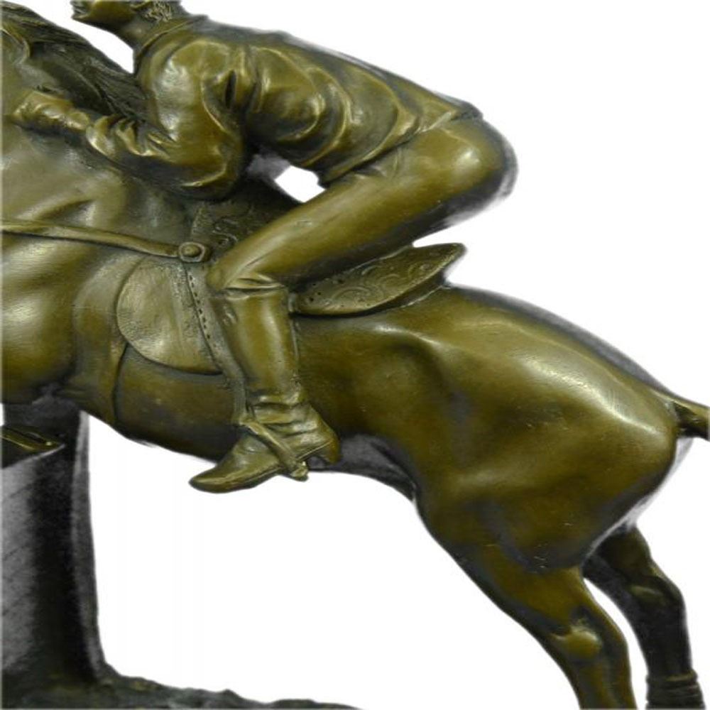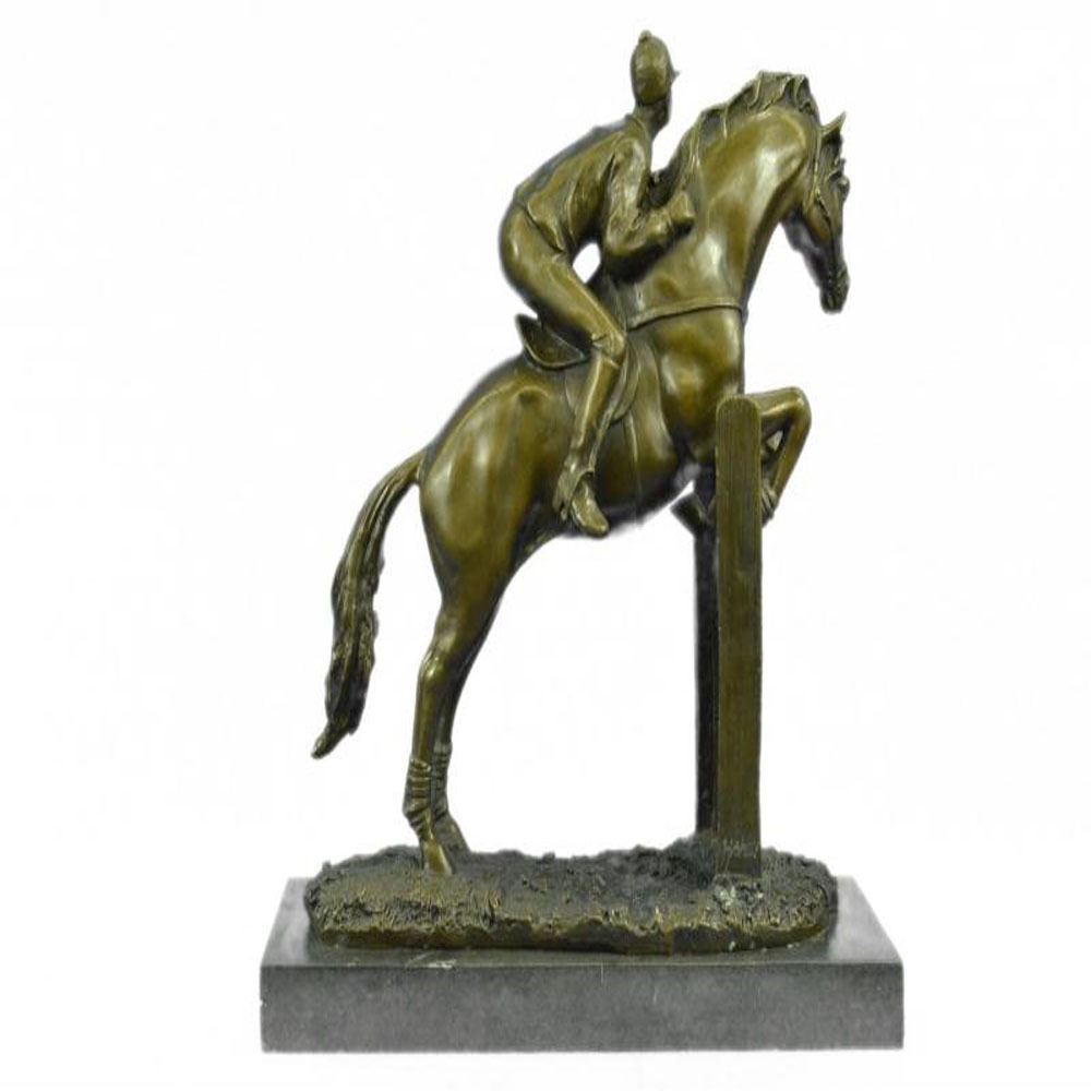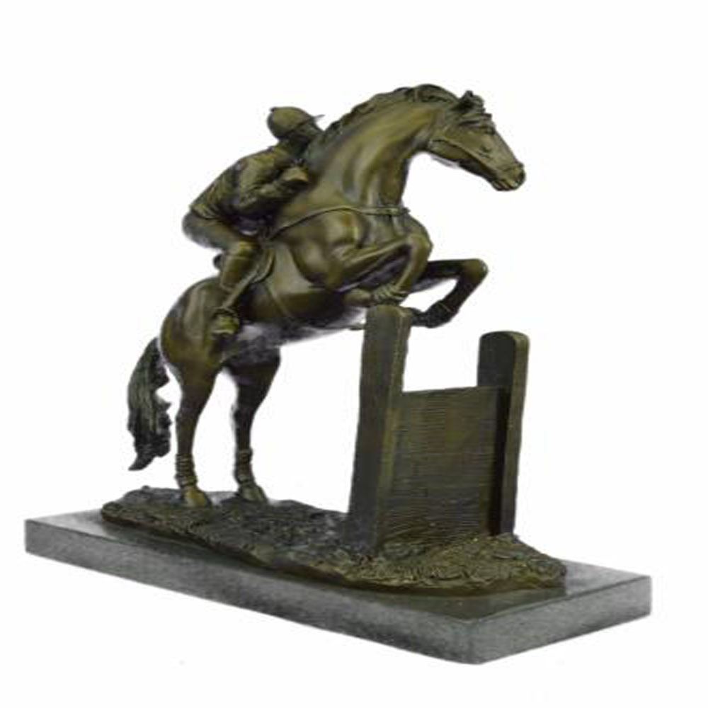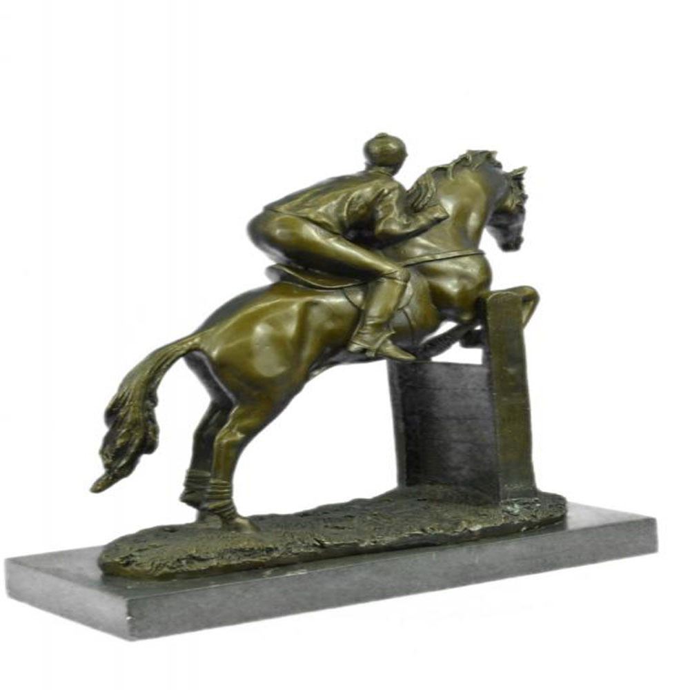 This thoroughbred and jockey are on a mission to win first place. In full stride this horse gallops his way to a fast finish. Running on a grass track this horse refuses to lose this derby. He exerts full speed as he pushes against the wind, his tail flys back with force, as the jockey encourages his partner to go full speed ahead. The jockey and the Horse both wear a look of determination as they stare down the finish line. The Horse lets out a neigh while pushing himself to the limit. Beautifully detailed his muscles are hard as he runs, his chest bulges with energy. The grass seems to be untouched with hoof prints assuming our horse has the lead. The jockey stays concentrated as he kicks his heels inward, keeping his feet in the stirrups. This is a great action piece and deserves to be displayed up front and center on a glory wall. This is a great gift to give for an avid horse lover it is also suitable for the person with drive in their life. The handmade Bronze Sculpture was molded using the ageold method of lost wax casting and stained with a brown patina finish for preservation. It is mounted upon a marble base. Bronze Dimensions with Marble Base: Height 13 X Width 12 inches. Weight: 12 LBS.