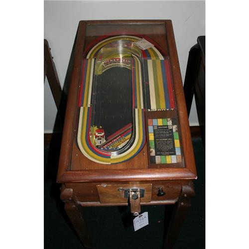 Jockey Club Pinball Game - Test your observation faculties. By studying the position of the horses in the last race, you can mathematically determine the winners in the next race. Nice graphics on playing field. Measures approximately 17" x 32" x 37" H.