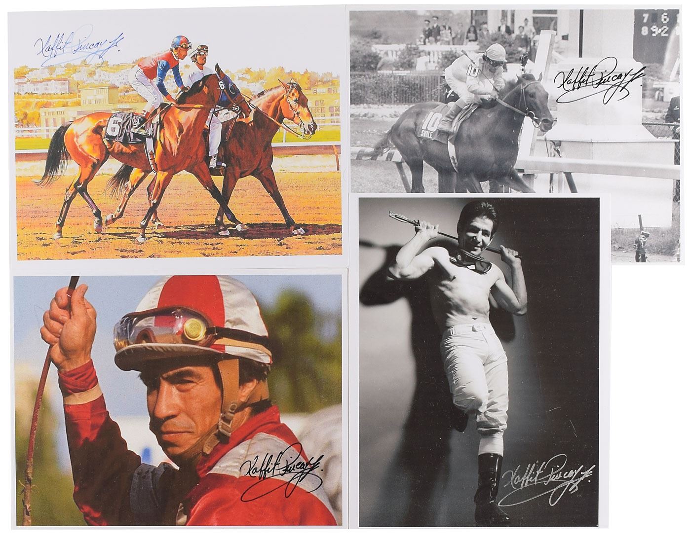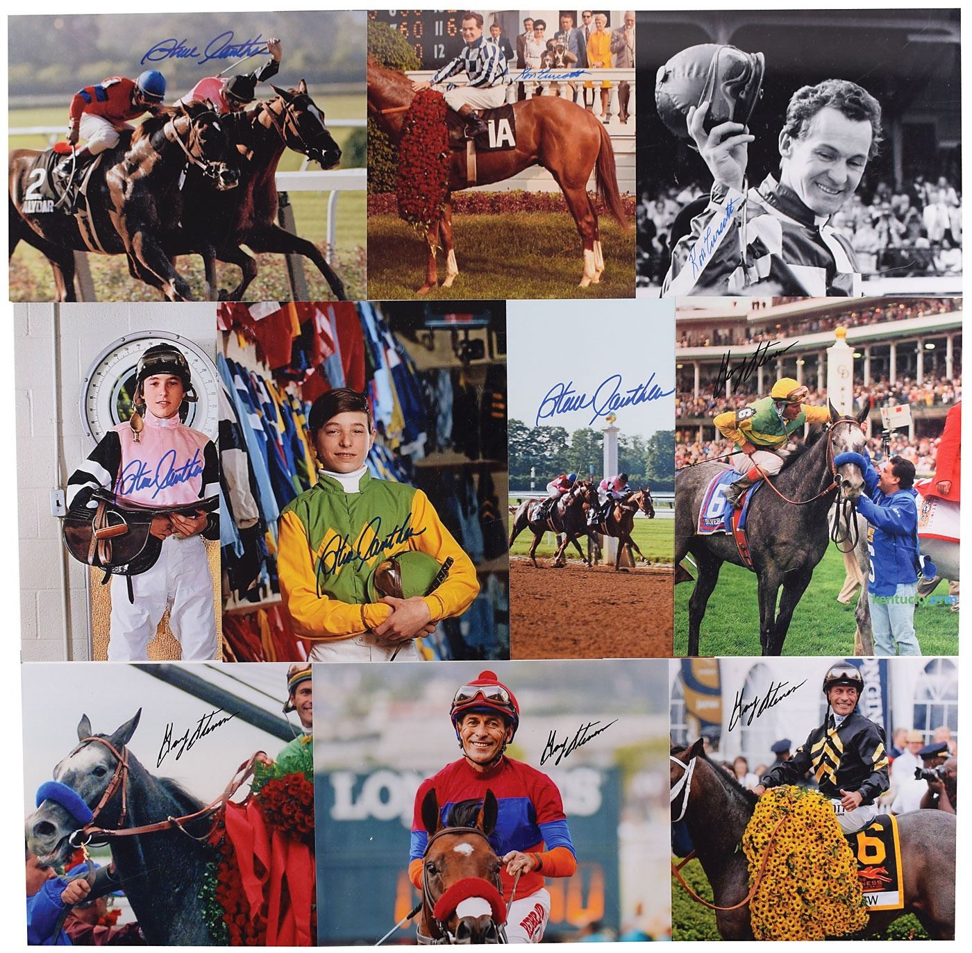 Group lot of 14 photos, glossy and laserprint, ranging in size from 8 x 10 to 11 x 8.5, each signed in ink or felt tip by a legendary race horse jockey, including: Steve Cauthen (4), Laffit Pincay, Jr. (4), Gary Stevens (4), and Ron Turcotte (2). In overall fine condition.