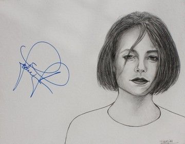 Black and white pencil drawing of Jodie Foster by Joseph Namsinh, signed by the actress in blue felt pen. Signed at the premiere of Jumanji at Sony Studios in 1995. Measures 16 x 20.
