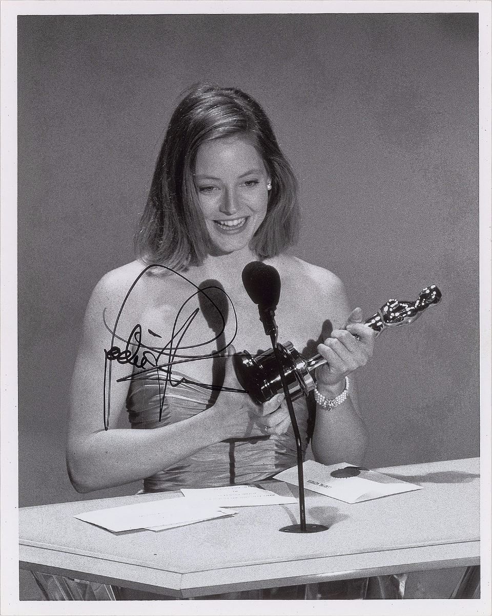 Wonderful glossy 8 x 10 photo of Foster receiving the Best Actress Oscar for her role in the 1988 film The Accused, signed in black felt tip. Reverse bears an AMPAS stamp. In very fine condition.
