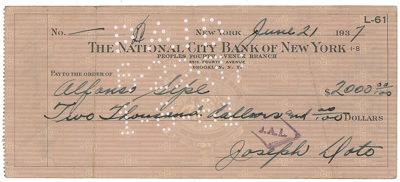 New York mobster, born Giuseppe Antonio Doto (1902–1971), who was influential in the rise of the modern Cosa Nostra. The National City Bank of New York check, 6.25 x 2.75, filled out and signed by Adonis, "Joseph Doto," payable to Alfonso Lepe for $2000, June 21, 1937. In very good to fine condition, with several vertical folds.
