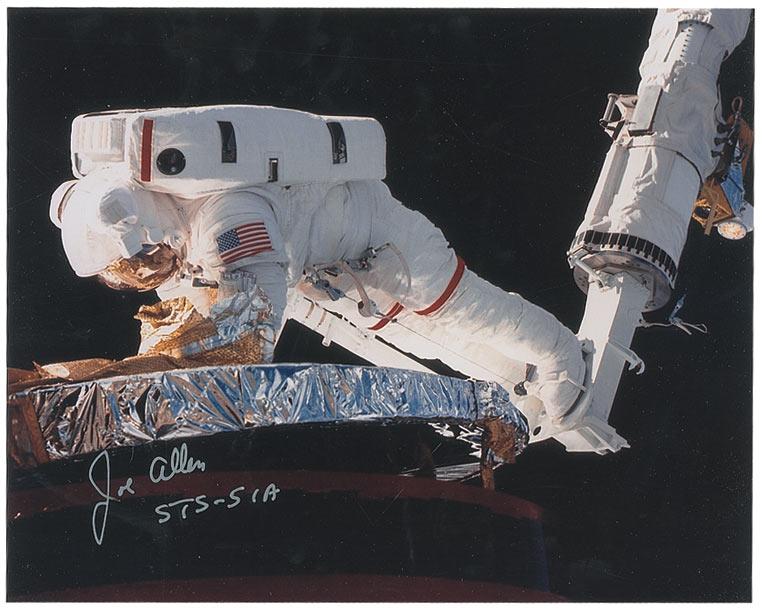 Color satin-finish 10 x 8 photo of Allen working on the shuttle in space, signed in silver ink, “Joe Allen, STS-51A.” In fine condition.