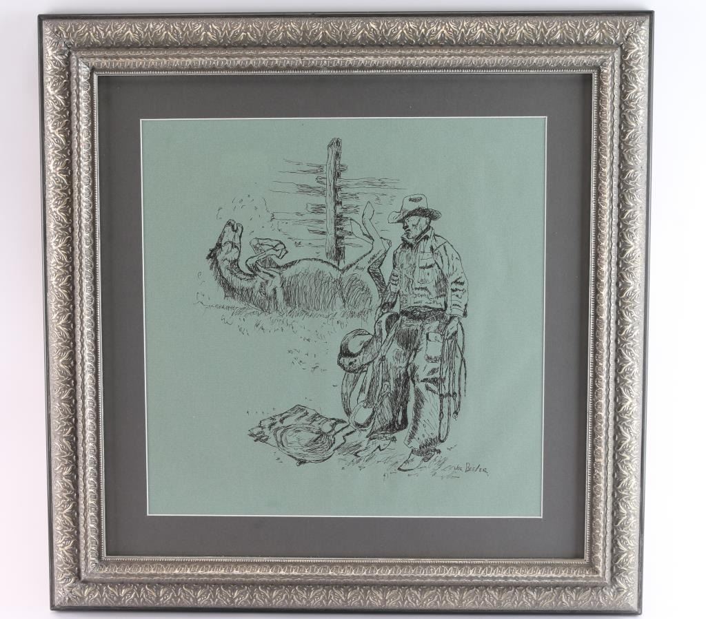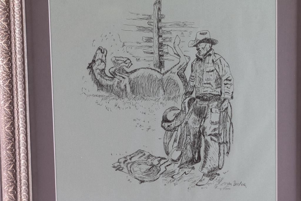 Titled " Dust Off". Signed lower right. Portrays a horse giving himself a dust bath by a corral as an angry cowboy waits for him to settle down. Measures 16" x 16", image only. Professionally framed and matted. Joe Beeler was a co-founder of cowboy artists of American and died in the saddle working cattle near Sedona, Arizona.