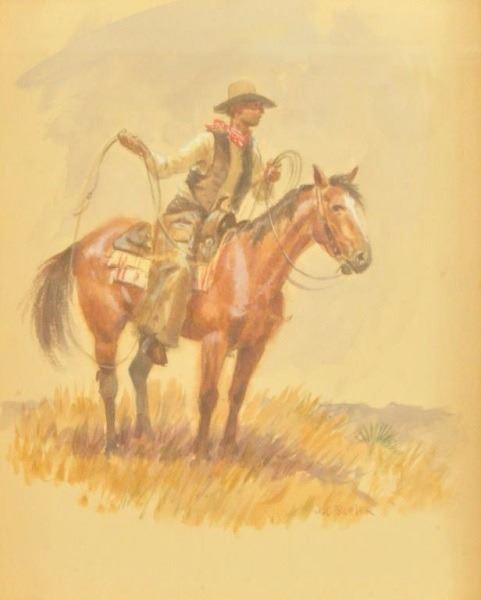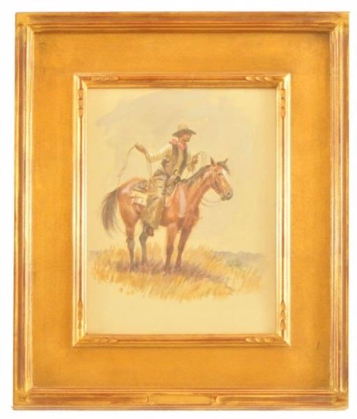 Joe Beeler was a real cowboy as well as a top artist. Notice the horse's ears. One is cocked back to the rider, and one is cocked forward to the animal about to be roped. Chet Downs calls this painting "Listo" which means "ready" in English. Painting: 11" x 14-1/2", Frame: 18-3/4" x 21-3/4".