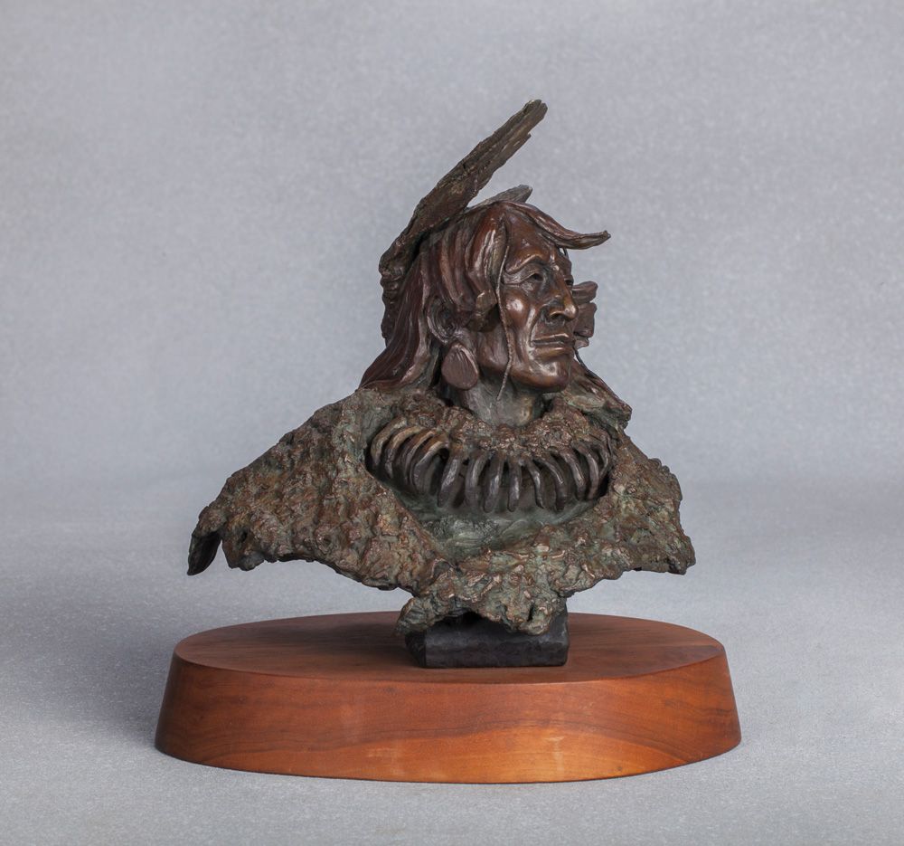 Joe Beeler CAA (1931 -2006). Untitled (Indian bust). 9" x 9" x 7" (plus 1 1/2" wood base). Bronze. Signed in bronze, 20/30.